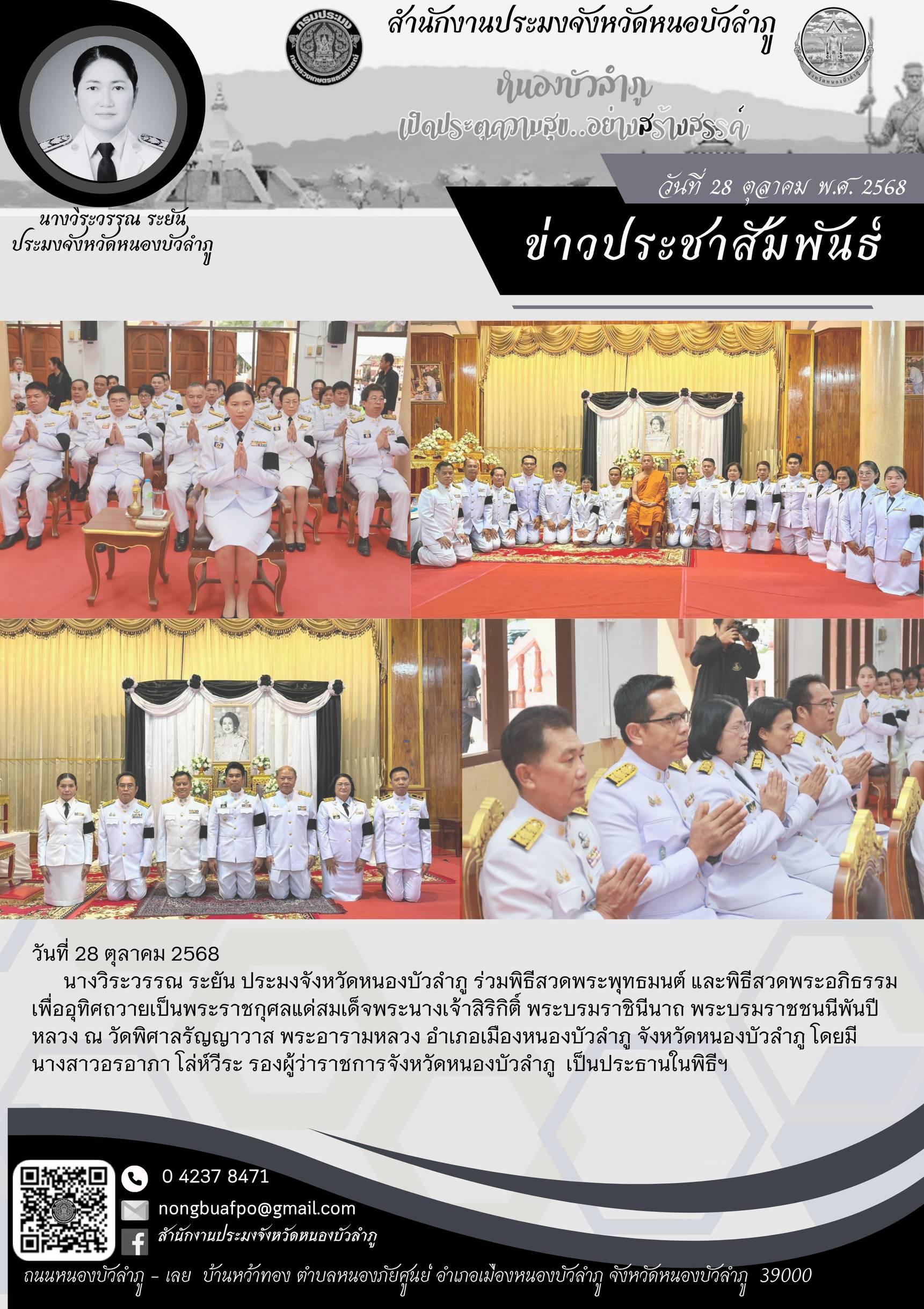 นางวิระวรรณ ระยัน ประมงจังหวัดหนองบัวลำภู ร่วมพิธีสวดพระพุทธมนต์ และพิธีสวดพระอภิธรรม เพื่ออุทิศถวายเป็นพระราชกุศลแด่สมเด็จพระนางเจ้าสิริกิติ์ พระบรมราชินีนาถ พระบรมราชชนนีพันปีหลวง ณ วัดพิศาลรัญญาวาส พระอารามหลวง อำเภอเมืองหนองบัวลำภู จังหวัดหนองบัวลำภู โดยมีนางสาวอรอาภา โล่ห์วีระ รองผู้ว่าราชการจังหวัดหนองบัวลำภู เป็นประธานในพิธีฯ