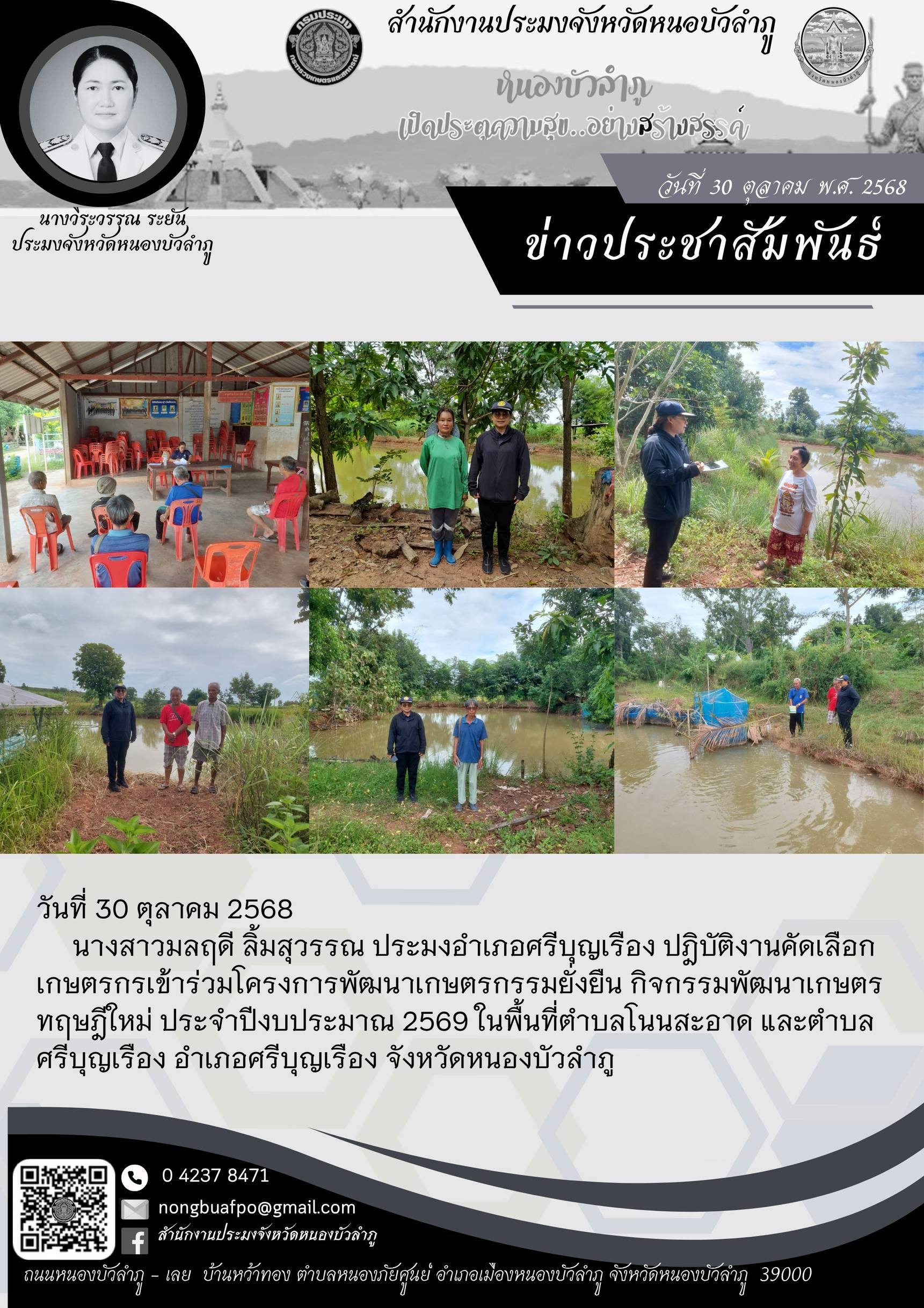 นางสาวมลฤดี ลิ้มสุวรรณ ประมงอำเภอศรีบุญเรือง ปฎิบัติงานคัดเลือกเกษตรกรเข้าร่วมโครงการพัฒนาเกษตรกรรมยั่งยืน กิจกรรมพัฒนาเกษตรทฤษฎีใหม่ ประจำปีงบประมาณ 2569 ในพื้นที่ตำบลโนนสะอาด และตำบลศรีบุญเรือง อำเภอศรีบุญเรือง จังหวัดหนองบัวลำภู