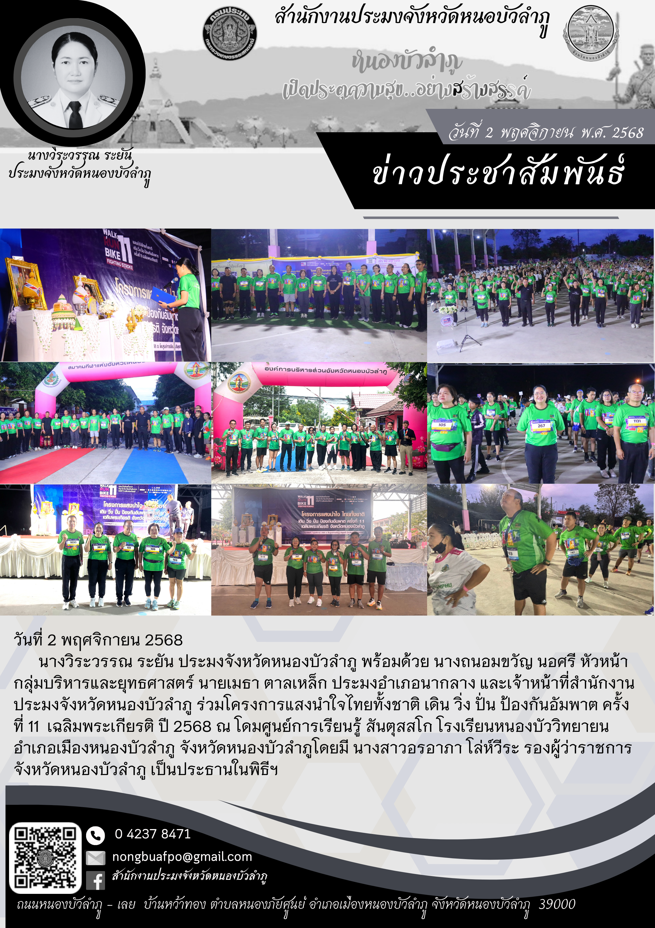 นางวิระวรรณ ระยัน ประมงจังหวัดหนองบัวลำภู พร้อมด้วย นางถนอมขวัญ นอศรี หัวหน้ากลุ่มบริหารและยุทธศาสตร์ นายเมธา ตาลเหล็ก ประมงอำเภอนากลาง และเจ้าหน้าที่สำนักงานประมงจังหวัดหนองบัวลำภู ร่วมโครงการแสงนำใจไทยทั้งชาติ เดิน วิ่ง ปั่น ป้องกันอัมพาต ครั้งที่ 11 เฉลิมพระเกียรติ ปี 2568 ณ โดมศูนย์การเรียนรู้ สันตุสสโก โรงเรียนหนองบัววิทยายน อำเภอเมืองหนองบัวลำภู จังหวัดหนองบัวลำภูโดยมี นางสาวอรอาภา โล่ห์วีระ รองผู้ว่าราชการจังหวัดหนองบัวลำภู เป็นประธานในพิธีฯ
