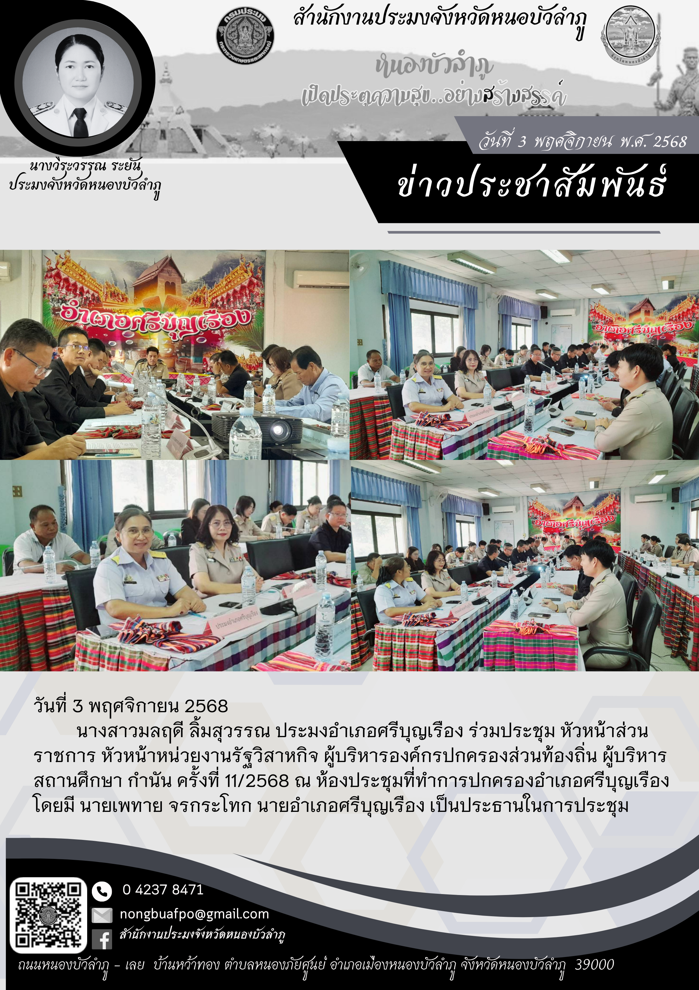 นางสาวมลฤดี ลิ้มสุวรรณ ประมงอำเภอศรีบุญเรือง ร่วมประชุม หัวหน้าส่วนราชการ หัวหน้าหน่วยงานรัฐวิสาหกิจ ผู้บริหารองค์กรปกครองส่วนท้องถิ่น ผู้บริหารสถานศึกษา กำนัน ครั้งที่ 11/2568 ณ ห้องประชุมที่ทำการปกครองอำเภอศรีบุญเรือง โดยมี นายเพทาย จรกระโทก นายอำเภอศรีบุญเรือง เป็นประธานในการประชุม