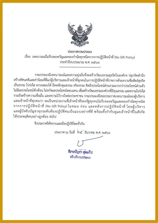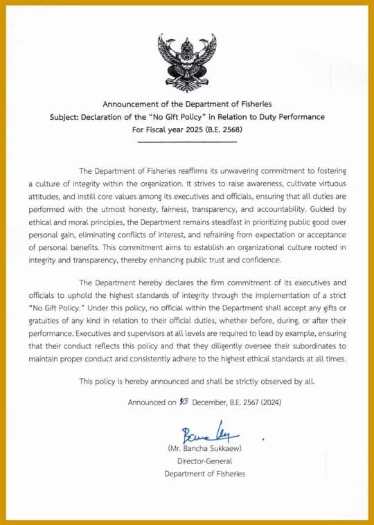 No Gift Policy ประกาศกรมประมง เรื่อง เจตนารมณ์ไม่รับของขวัญ และของกำนัลทุกชนิดจากการปฏิบัติหน้าที่ ประจำ ปีงบประมาณ พ.ศ. 2568