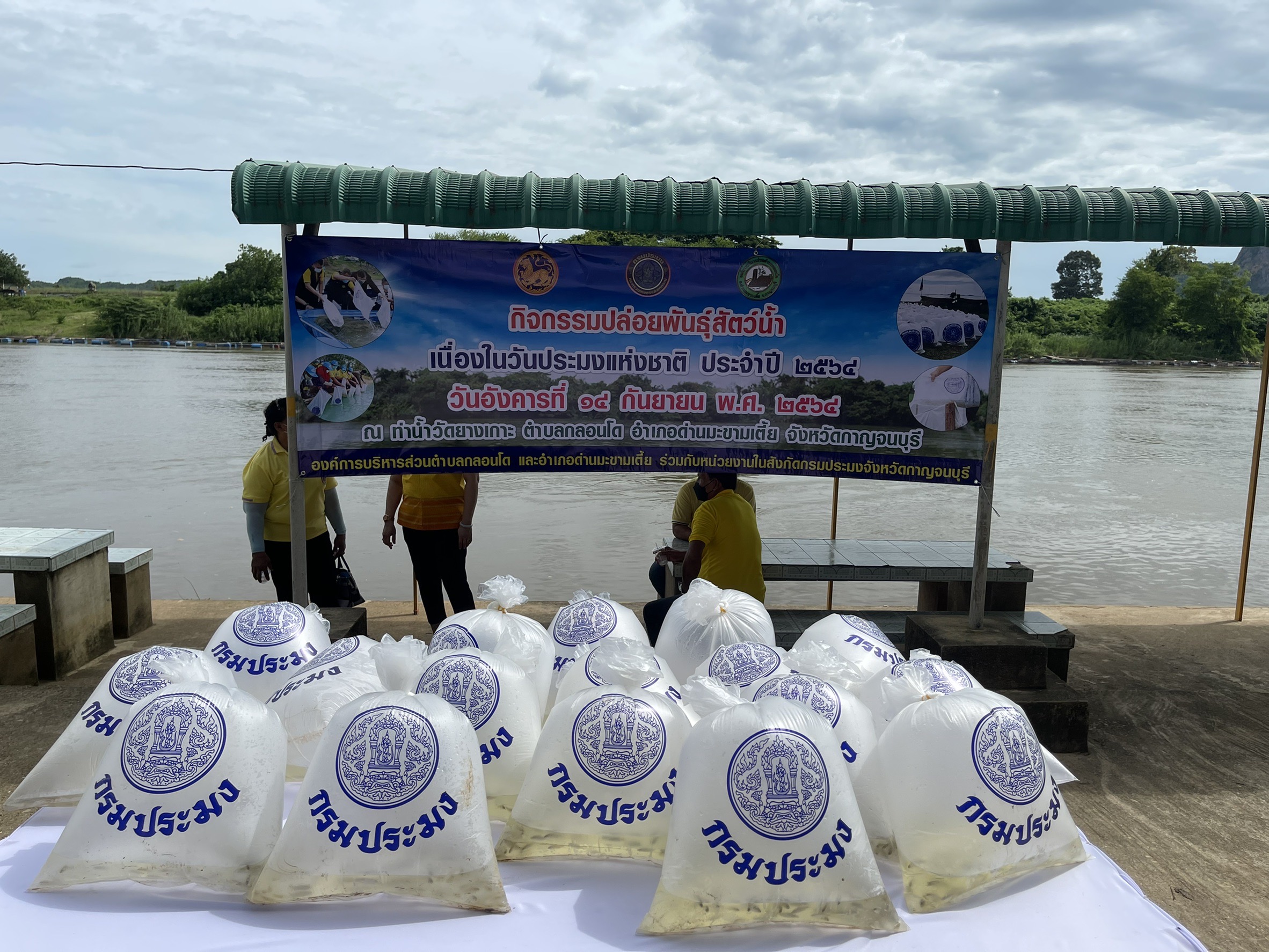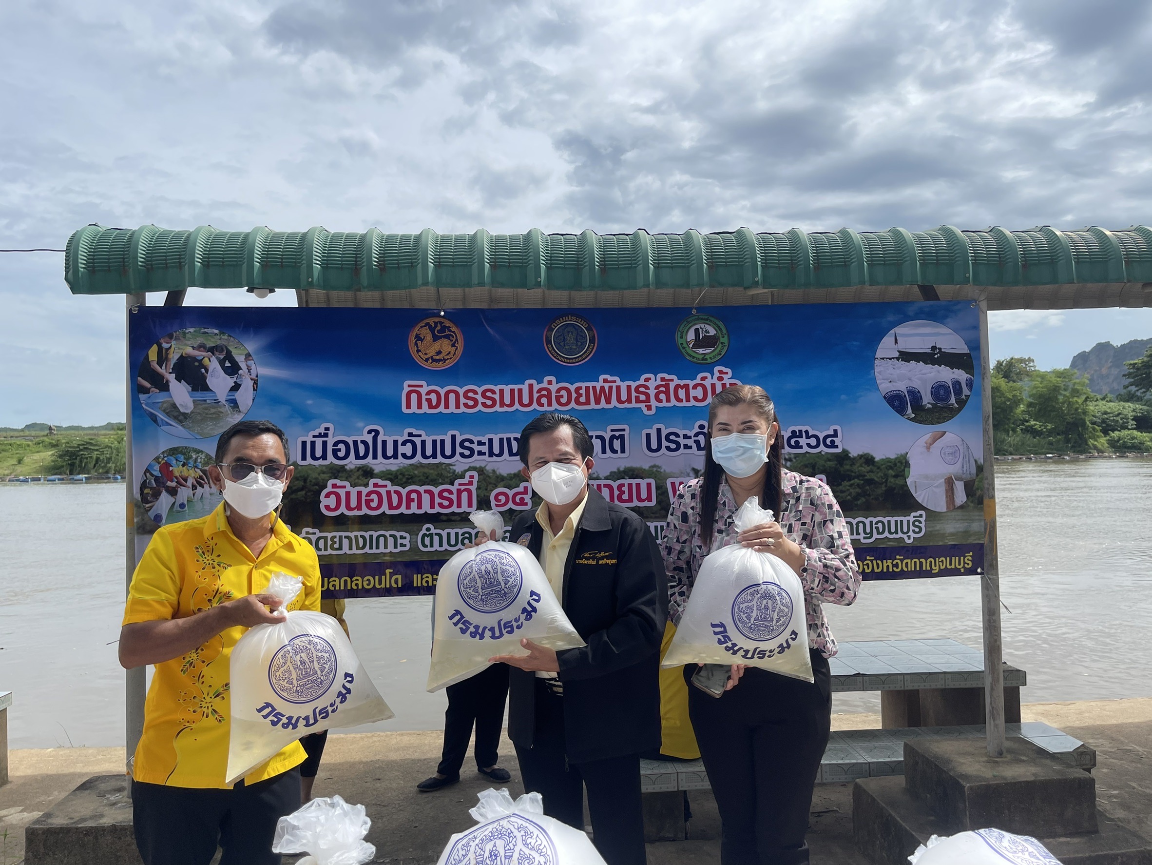 นายวรรณนัฑ หิรัญชุฬหะ ประมงจังหวัดกาญจนบุรี พร้อมด้วย นายทรงจำ เครื่องสาย ประมงอำเภอท่าม่วง นายณรงค์ เทศธรรม ประมงอำเภอทองผาภูมิ นางสาวศิวพร ราชสุวรรณ ประมงอำเภอพนมทวน นายสุเวชย์ สินชัย เจ้าพนักงานประมงชำนาญงาน  นายกรกวี ศรีอินทร์ นักวิชาการประมง นางสาวณัฐวรรณ สุขสม เจ้าหน้าที่วิเคราะห์นโยบายและแผน นางสาวฐานภา ปลาทิพย์ เจ้าหน้าที่วิเคราะห์นโยบายและแผน และนายวิเลียน ดิษฐบรรจง พนักงานขับรถ ได้ร่วมจัดกิจกรรมปล่อยพันธุ์สัตว์น้ำ ประเภทปลากินพืชจำนวน 250,000 ตัว เนื่องในวันประมงแห่งชาติ ประจำปี 2564 ณ วัดยางเกาะ ต.กลอนโด อ.ด่านมะขามเตี้ย จ.กาญจนบุรี ซึ่งได้รับการสนับสนุนพันธุ์ปลาจากศูนย์วิจัยและพัฒนาประมงน้ำจืดกาญจนบุรี