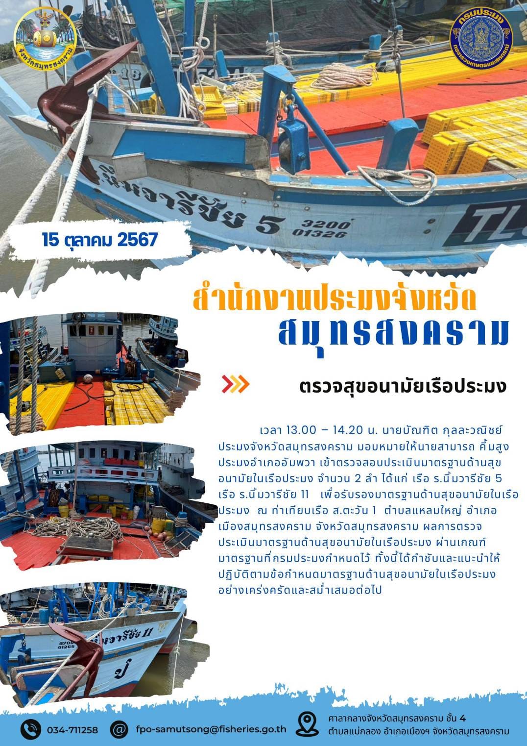 [2025-10-21] กรมประมงออกประกาศฉบับใหม่ ยกระดับมาตรฐานด้านสุขอนามัยในเรือประมง รองรั.. [2025-09-26] รายงานผลการดำเนินการตามนโยบาย No gift Policy จากการปฎิบัติหน้าที่.. [2025-09-26] แบบสรุปรายงานการรับทรัพย์สินหรือประโยชน์อื่นใดอันอาจคำนวณเป็นเงินได้.. [2025-09-22] Samutsongkhram Province's No - Gift Policy commitment "lntegrous and T.. [2025-09-22] ประกาศเจตนารมณ์ เรื่อง "สุจริต โปร่งใส จังหวัดสมุทรสงคราม ใสสะอาด 2568.. [2025-06-23] เปิดรับสมัครเกษตรกรผู้เพาะเลี้ยงสัตว์น้ำที่ต้องการขอรับการสนับสนุนปัจจ.. [2025-06-06] ประกาศสำนักงานประมงจังหวัดสมุทรสงคราม เรื่อง รายชื่อเกษตรกรผู้เพาะเลี.. [2025-05-15] ประกาศกรมประมง เรื่อง ขอให้เกษตรกรผู้เพาะเลี้ยงสัตว์น้ำที่ต้องการขอรับ.. [2025-05-15] เปิดรับซื้อปลาหมอคางดำ โครงการควบคุมและกำจัดปลาหมอค่งดำอย่างต่อเนื่อง.. [2025-05-01] ประกาศสำนักงานประมงจังหวัดสมุทรสงคราม เรื่อง ประกาศรายชื่อผู้ที่ได้รับ.. อ่านทั้งหมด