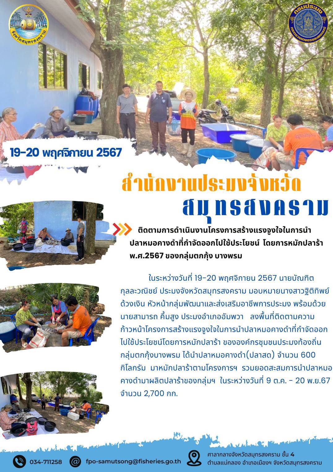 ในระหว่างวันที่ 19-20 พฤศจิกายน 2567 นายบัณฑิต กุลละวณิชย์ ประมงจังหวัดสมุทรสงคราม มอบหมายนางสาวฐิติทิพย์ ด้วงเงิน หัวหน้ากลุ่มพัฒนาและส่งเสริมอาชีพการประมง พร้อมด้วยนายสามารถ คึ้มสูง ประมงอำเภออัมพวา   ลงพื้นที่ติดตามความก้าวหน้าโครงการสร้างแรงจูงใจในการนำปลาหมอคางดำที่กำจัดออก ไปใช้ประโยชน์โดยการหมักปลาร้า ขององค์กรชุมชนประมงท้องถิ่น กลุ่มตกกุ้งบางพรม นำปลาหมอคางดำ(ปลาสด) จำนวน 600 กิโลกรัม  มาหมักปลาร้าตามโครงการฯ รวมยอดสะสมการนำปลาหมอคางดำมาหมักปลาร้า ของกลุ่มฯ