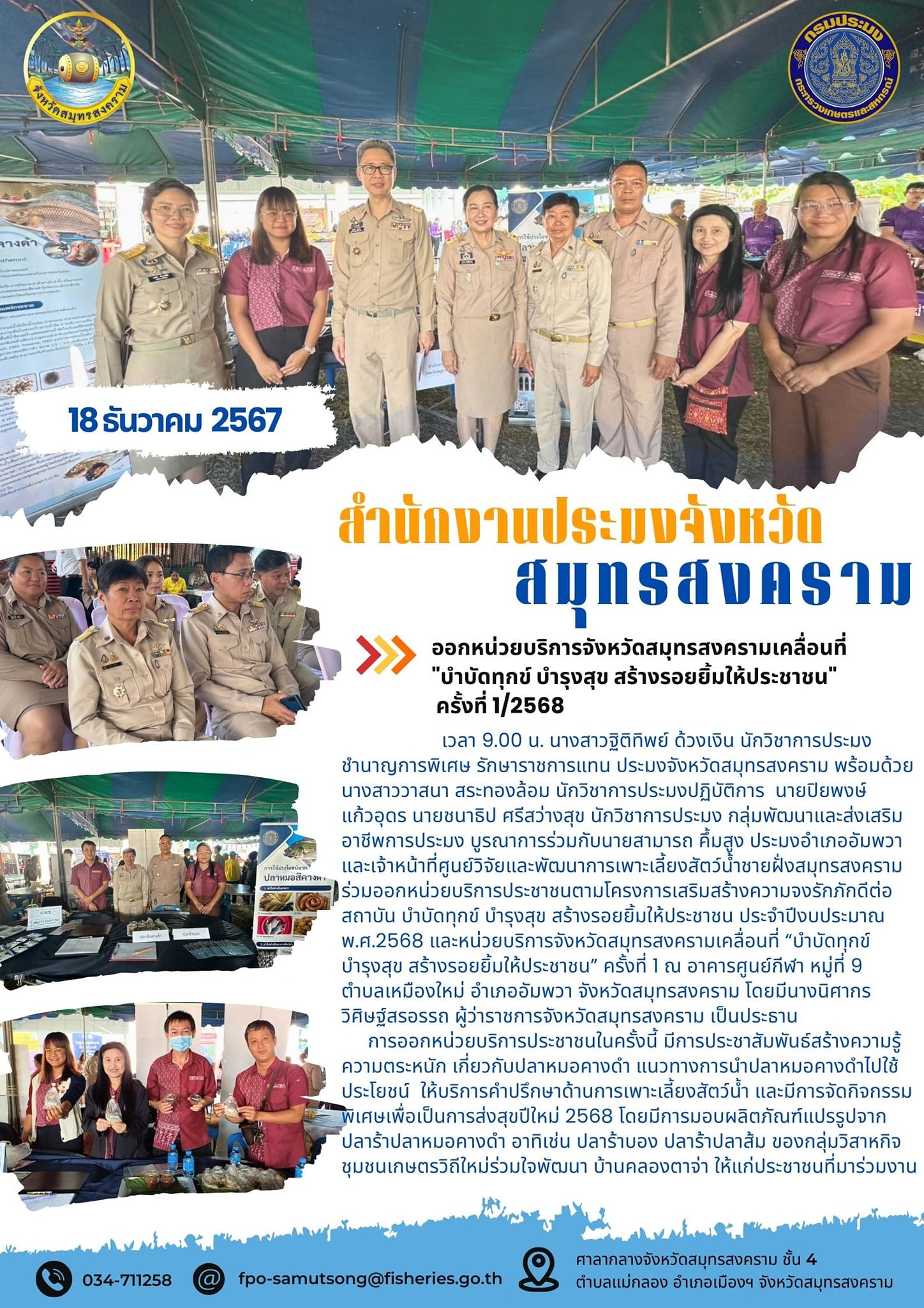 เวลา 9.00 น. นางสาวฐิติทิพย์ ด้วงเงิน นักวิชาการประมงชำนาญการพิเศษ รักษาราชการแทนประมงจังหวัดสมุทรสงคราม พร้อมด้วยนางสาววาสนา สระทองล้อม นักวิชาการประมงปฏิบัติการ นายปิยพงษ์ แก้วอุดร นายชนาธิป ศรีสว่างสุข นักวิชาการประมง กลุ่มพัฒนาและส่งเสริมอาชีพการประมง บูรณาการร่วมกับนายสามารถ คึ้มสูง ประมงอำเภออัมพวา และเจ้าหน้าที่ศูนย์วิจัยและพัฒนาการเพาะเลี้ยงสัตว์น้ำชายฝั่งสมุทรสงคราม ร่วมออกหน่วยบริการประชาชนตามโครงการเสริมสร้างความจงรักภักดีต่อสถาบัน บำบัดทุกข์ บำรุงสุข สร้างรอยยิ้มให้ประชาชน ประจำปีงบประมาณ พ.ศ.2568 และหน่วยบริการจังหวัดสมุทรสงครามเคลื่อนที่ “บำบัดทุกข์ บำรุงสุข สร้างรอยยิ้มให้ประชาชน” ครั้งที่ 1 ณ อาคารศูนย์กีฬา หมู่ที่ 9 ตำบลเหมืองใหม่ อำเภออัมพวา จังหวัดสมุทรสงคราม โดยมีนางนิศากร วิศิษฐ์สรอรรถ ผู้ว่าราชการจังหวัดสมุทรสงคราม เป็นประธาน