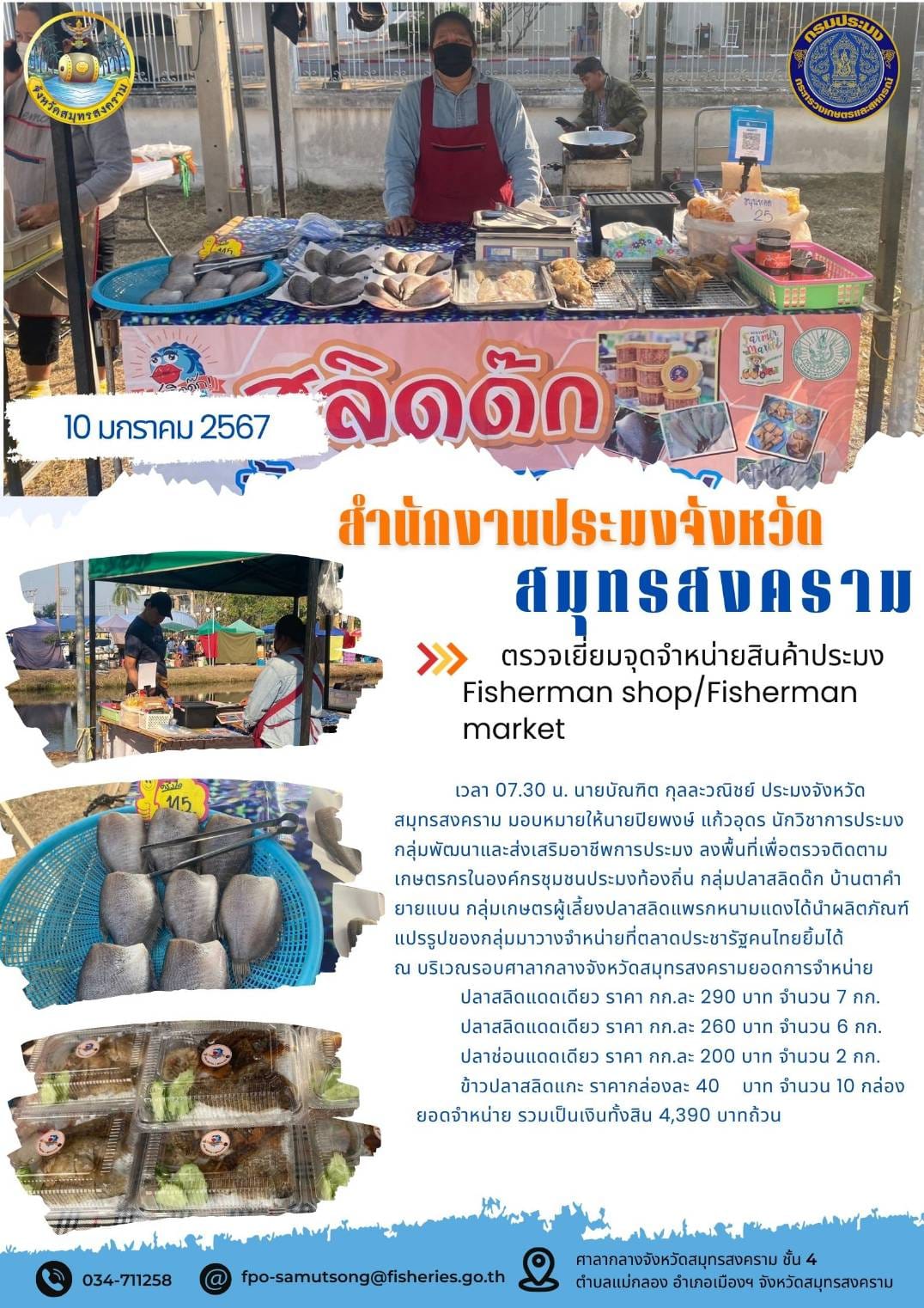 เวลา 07.30 น. นายบัณฑิต กุลละวณิชย์ ประมงจังหวัดสมุทรสงคราม มอบหมายให้นายปิยพงษ์ แก้วอุดร นักวิชาการประมง กลุ่มพัฒนาและส่งเสริมอาชีพการประมง ลงพื้นที่เพื่อตรวจติดตามเกษตรกรในองค์กรชุมชนประมงท้องถิ่น กลุ่มปลาสลิดด๊ก บ้านตาคำยายแบน กลุ่มเกษตรผู้เลี้ยงปลาสลิดแพรกหนามแดงได้นำผลิตภัณฑ์แปรรูปของกลุ่มมาวางจำหน่ายที่ตลาดประชารัฐคนไทยยิ้มได้ ณ บริเวณรอบศาลากลางจังหวัดสมุทรสงครามยอดการจำหน่าย