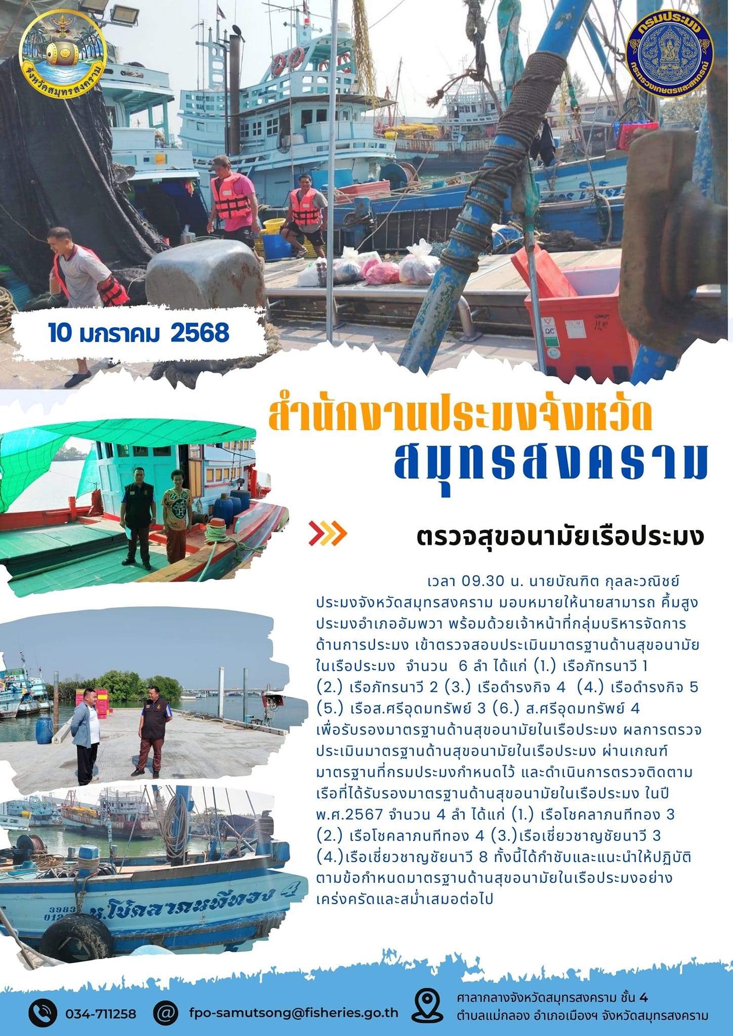 [2025-10-21] กรมประมงออกประกาศฉบับใหม่ ยกระดับมาตรฐานด้านสุขอนามัยในเรือประมง รองรั.. [2025-09-26] รายงานผลการดำเนินการตามนโยบาย No gift Policy จากการปฎิบัติหน้าที่.. [2025-09-26] แบบสรุปรายงานการรับทรัพย์สินหรือประโยชน์อื่นใดอันอาจคำนวณเป็นเงินได้.. [2025-09-22] Samutsongkhram Province's No - Gift Policy commitment "lntegrous and T.. [2025-09-22] ประกาศเจตนารมณ์ เรื่อง "สุจริต โปร่งใส จังหวัดสมุทรสงคราม ใสสะอาด 2568.. [2025-06-23] เปิดรับสมัครเกษตรกรผู้เพาะเลี้ยงสัตว์น้ำที่ต้องการขอรับการสนับสนุนปัจจ.. [2025-06-06] ประกาศสำนักงานประมงจังหวัดสมุทรสงคราม เรื่อง รายชื่อเกษตรกรผู้เพาะเลี.. [2025-05-15] ประกาศกรมประมง เรื่อง ขอให้เกษตรกรผู้เพาะเลี้ยงสัตว์น้ำที่ต้องการขอรับ.. [2025-05-15] เปิดรับซื้อปลาหมอคางดำ โครงการควบคุมและกำจัดปลาหมอค่งดำอย่างต่อเนื่อง.. [2025-05-01] ประกาศสำนักงานประมงจังหวัดสมุทรสงคราม เรื่อง ประกาศรายชื่อผู้ที่ได้รับ.. อ่านทั้งหมด
