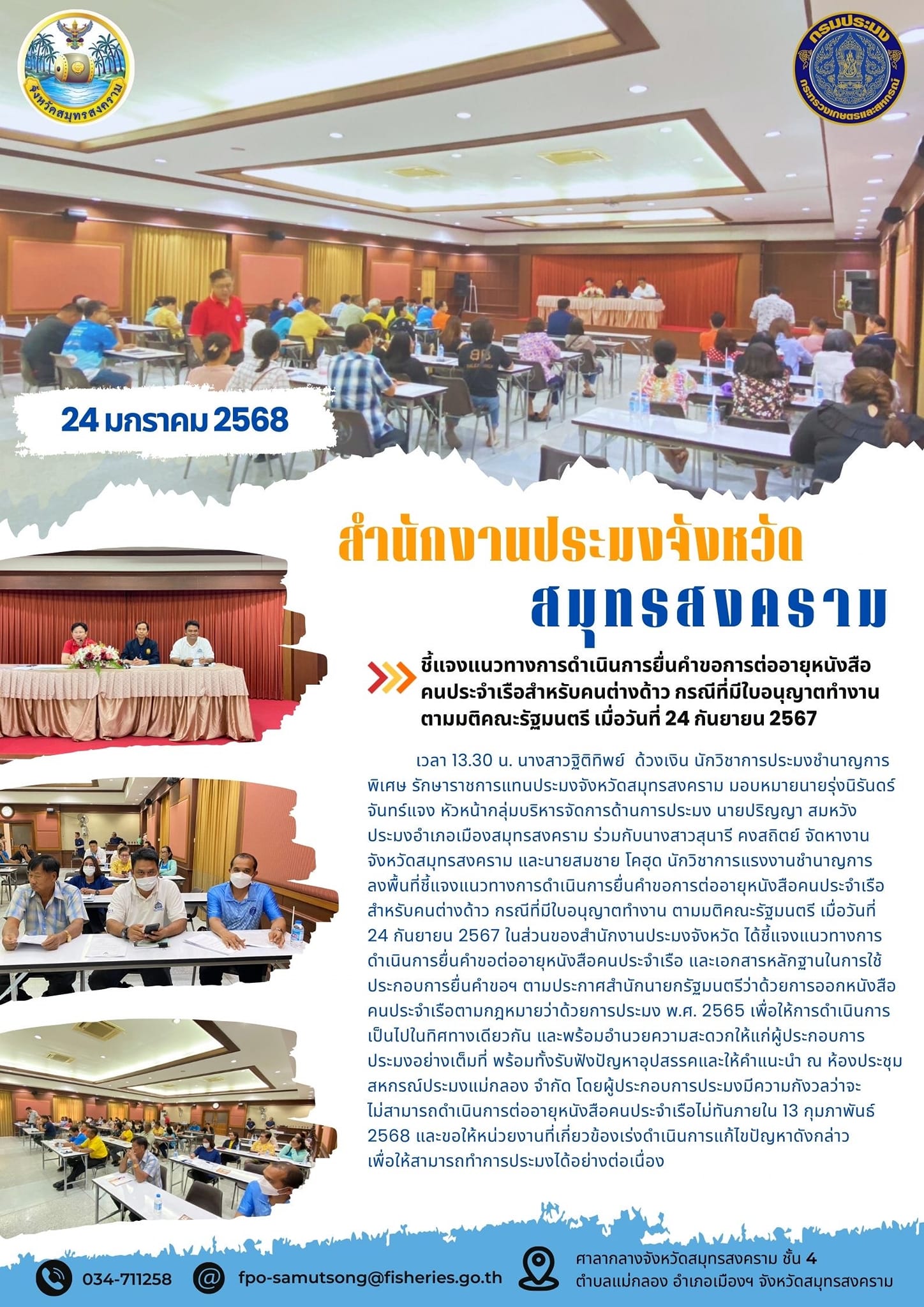 ชี้แจงแนวทางการดำเนินการยื่นคำขอการต่ออายุหนังสือ คนประจำเรือสำหรับคนต่างด้าว กรณีที่มีที่มีใบอนุญาตทำงาน ตามมติคณะรัฐมนตรี เมื่อวันที่ 24 กันยายน 2567