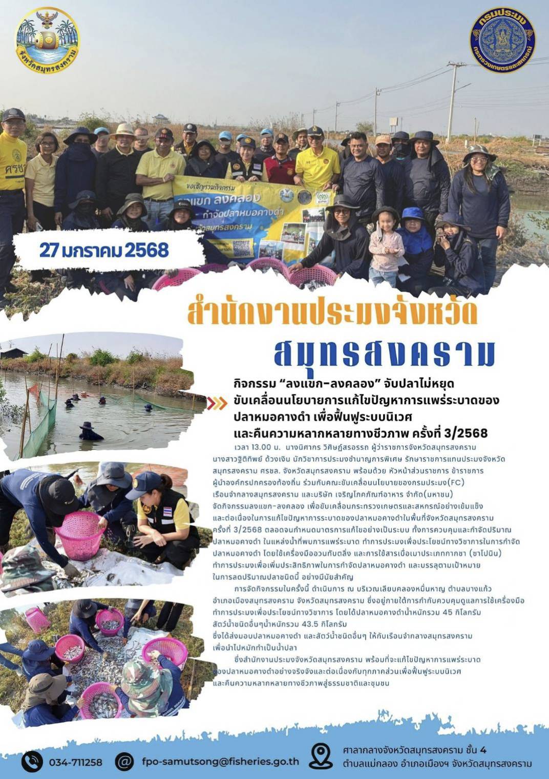กิจกรรมลงแขก-ลงคลอง เพื่อขับเคลื่อนกระทรวงเกษตรและสหกรณ์อย่างเข้มแข็ง และต่อเนื่องในการแก้ไขปัญหาการระบาดของปลาหมอคางดำในพื้นที่จังหวัดสมุทรสงคราม ครั้งที่ 3/2568
