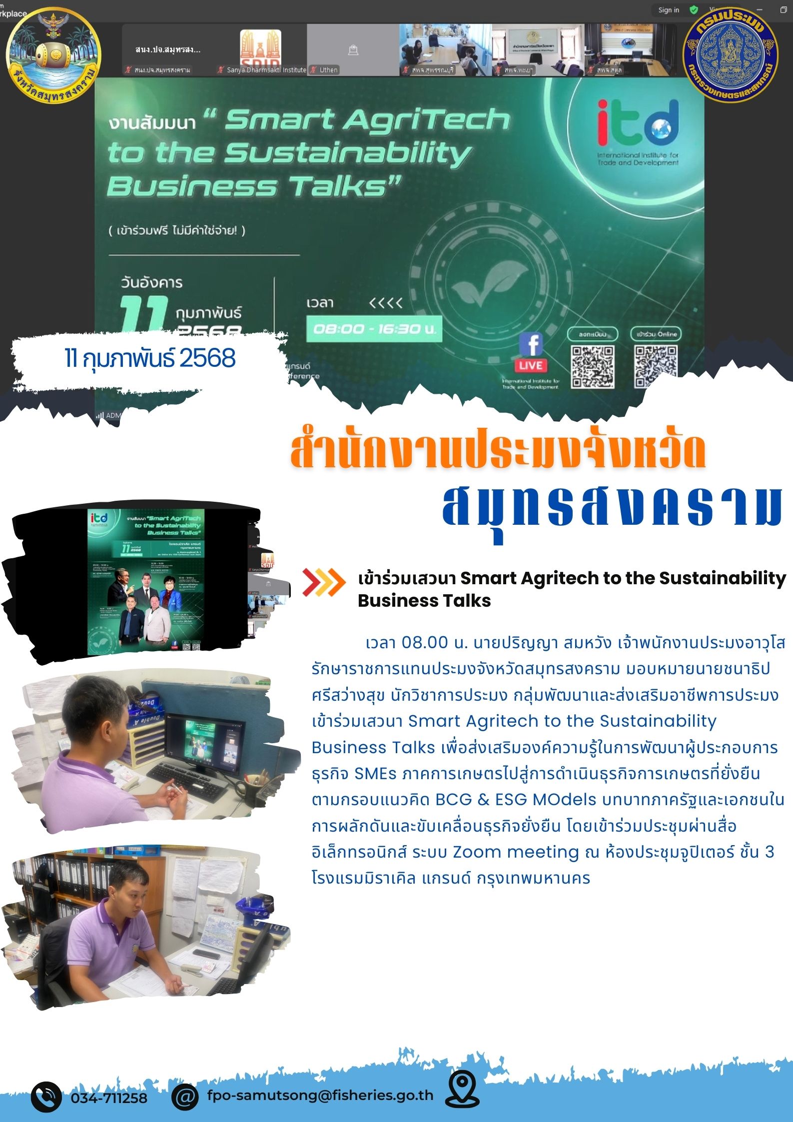 เวลา 08.00 น. นายปริญญา สมหวัง เจ้าพนักงานประมงอาวุโส รักษาราชการแทนประมงจังหวัดสมุทรสงคราม มอบหมายนายชนาธิป ศรีสว่างสุข นักวิชาการประมง กลุ่มพัฒนาและส่งเสริมอาชีพการประมง เข้าร่วมเสวนา Smart Agritech to the Sustainability Business Talks เพื่อส่งเสริมองค์ความรู้ในการพัฒนาผู้ประกอบการธุรกิจ SMEs ภาคการเกษตรไปสู่การดำเนินธุรกิจการเกษตรที่ยั่งยืน ตามกรอบแนวคิด BCG & ESG MOdels บทบาทภาครัฐและเอกชนในการผลักดันและขับเคลื่อนธุรกิจยั่งยืน โดยเข้าร่วมประชุมผ่านสื่ออิเล็กทรอนิกส์ ระบบ Zoom meeting ณ ห้องประชุมจูปิเตอร์ ชั้น 3 โรงแรมมิราเคิล แกรนด์ กรุงเทพมหานคร