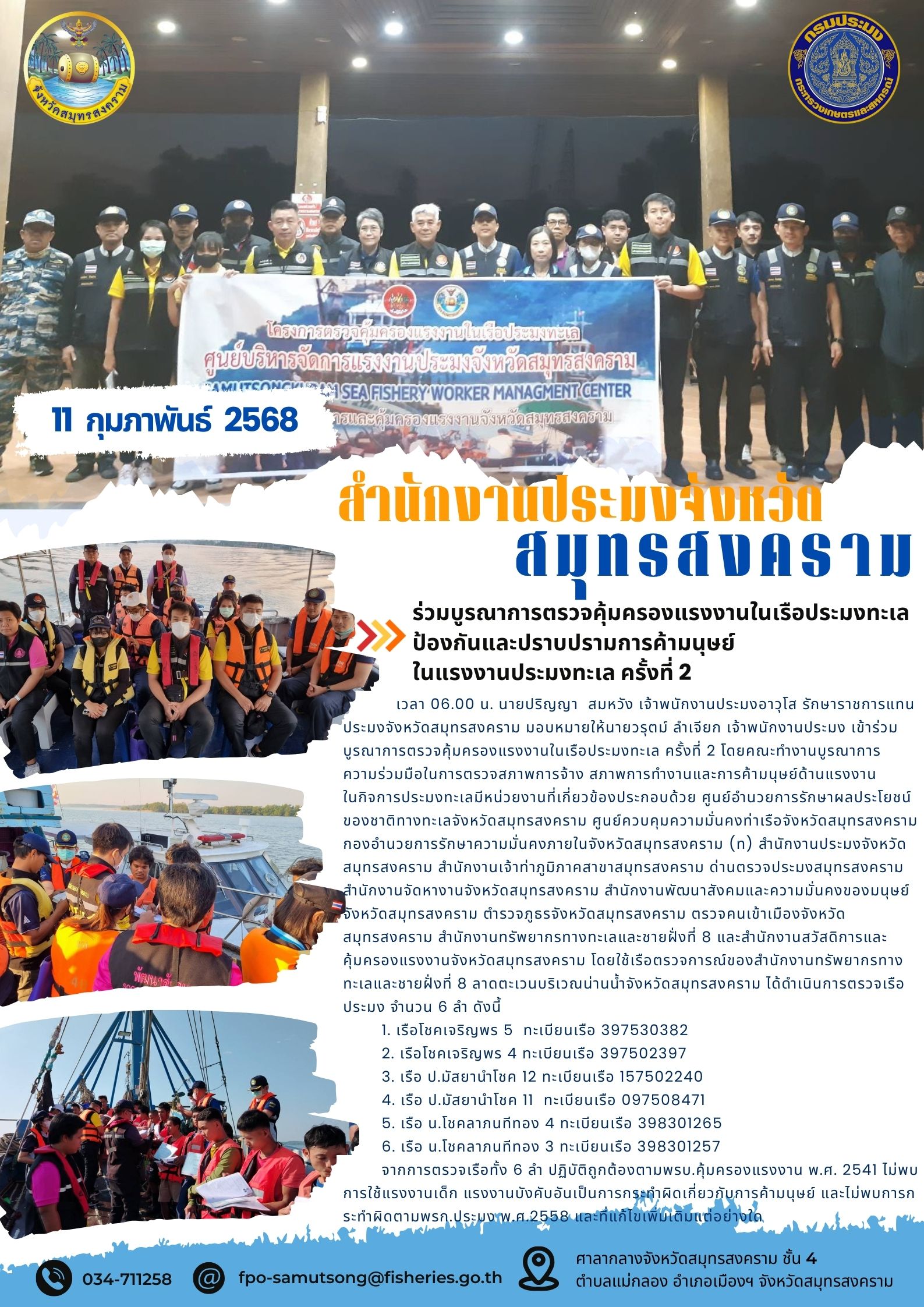 วันอังคารที่ 11 กุมภาพันธ์ 2568 เวลา 06.00 น. นายปริญญา สมหวัง เจ้าพนักงานประมงอาวุโส รักษาราชการแทนประมงจังหวัดสมุทรสงคราม มอบหมายให้นายวรุตม์ ลำเจียก เจ้าพนักงานประมง เข้าร่วมบูรณาการตรวจคุ้มครองแรงงานในเรือประมงทะเล ครั้งที่ 2 โดยคณะทำงานบูรณาการ ความร่วมมือในการตรวจสภาพการจ้าง สภาพการทำงานและการค้ามนุษย์ด้านแรงงาน ในกิจการประมงทะเลมีหน่วยงานที่เกี่ยวข้องประกอบด้วย ศูนย์อำนวยการรักษาผลประโยชน์ของชาติทางทะเลจังหวัดสมุทรสงคราม ศูนย์ควบคุมความมั่นคงท่าเรือจังหวัดสมุทรสงคราม กองอำนวยการรักษาความมั่นคงภายในจังหวัดสมุทรสงคราม (ท) สำนักงานประมงจังหวัดสมุทรสงคราม สำนักงานเจ้าท่าภูมิภาคสาขาสมุทรสงคราม ด่านตรวจประมงสมุทรสงคราม สำนักงานจัดหางานจังหวัดสมุทรสงคราม สำนักงานพัฒนาสังคมและความมั่นคงของมนุษย์จังหวัดสมุทรสงคราม ตำรวจภูธรจังหวัดสมุทรสงคราม ตรวจคนเข้าเมืองจังหวัดสมุทรสงคราม สำนักงานทรัพยากรทางทะเลและชายฝั่งที่ 8 และสำนักงานสวัสดิการและคุ้มครองแรงงานจังหวัดสมุทรสงคราม โดยใช้เรือตรวจการณ์ของสำนักงานทรัพยากรทางทะเลและชายฝั่งที่ 8 ลาดตะเวนบริเวณน่านน้ำจังหวัดสมุทรสงคราม ได้ดำเนินการตรวจเรือประมง จำนวน 6 ลำ ดังนี้