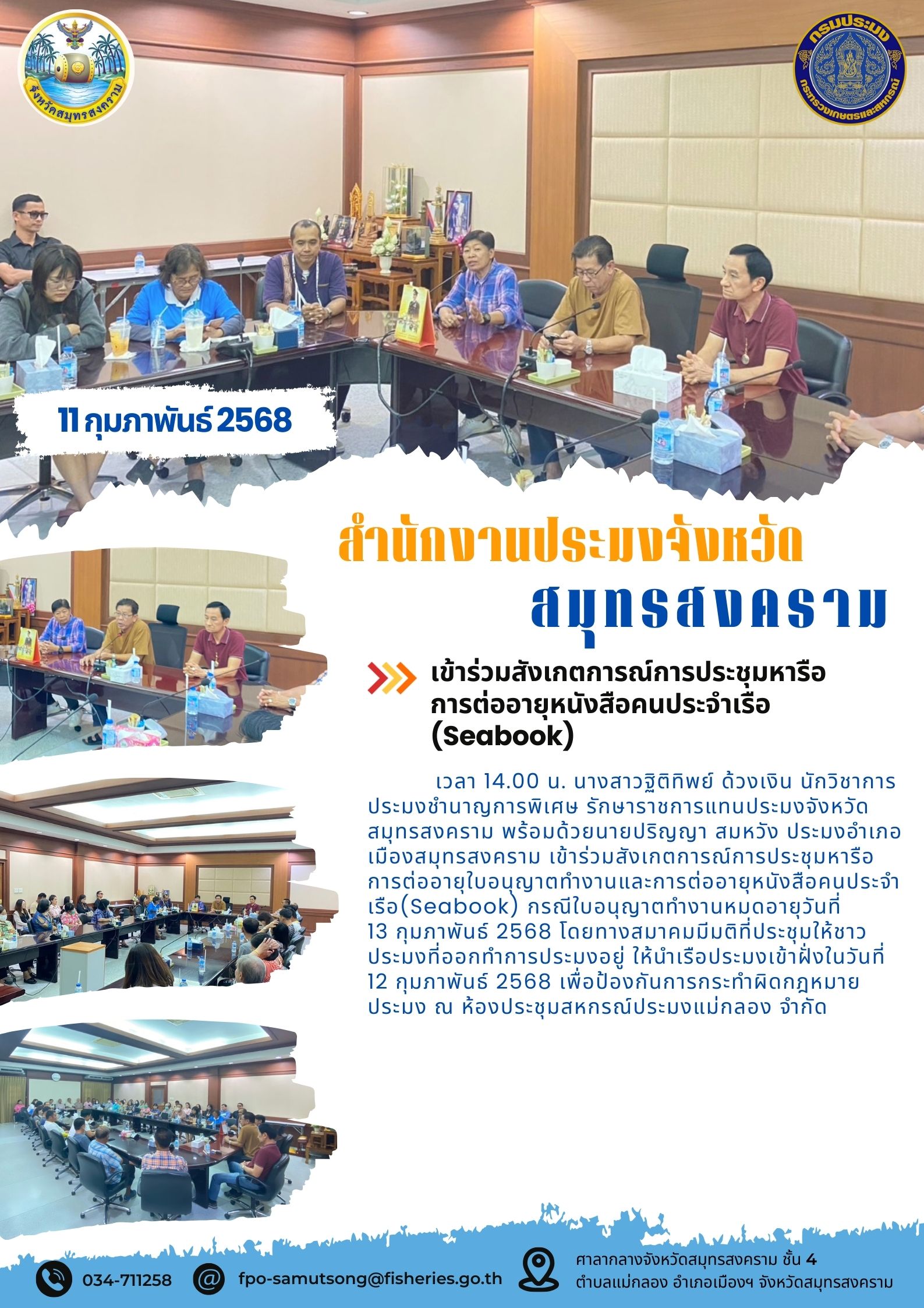 วันที่ 11 กุมภาพันธ์ 2568 เวลา 14.00 น. นางสาวฐิติทิพย์ ด้วงเงิน นักวิชาการประมงชำนาญการพิเศษ รักษาราชการแทนประมงจังหวัดสมุทรสงคราม พร้อมด้วยนายปริญญา สมหวัง ประมงอำเภอเมืองสมุทรสงคราม เข้าร่วมสังเกตการณ์การประชุมหารือการต่ออายุใบอนุญาตทำงานและการต่ออายุหนังสือคนประจำเรือ(Seabook) กรณีใบอนุญาตทำงานหมดอายุวันที่
