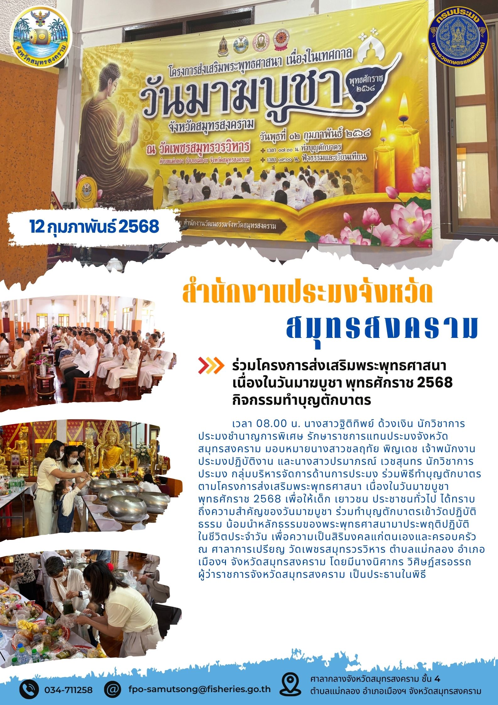วันที่ 12 กุมภาพันธ์ 2568 เวลา 08.00 น. นางสาวฐิติทิพย์ ด้วงเงิน นักวิชาการประมงชำนาญการพิเศษ รักษาราชการแทนประมงจังหวัดสมุทรสงคราม มอบหมายนางสาวชลฤทัย พิญเดช เจ้าพนักงานประมงปฏิบัติงาน และนางสาวปรมาภรณ์ เวชสุนทร นักวิชาการประมง กลุ่มบริหารจัดการด้านการประมง ร่วมพิธีทำบุญตักบาตร ตามโครงการส่งเสริมพระพุทธศาสนา เนื่องในวันมาฆบูชา พุทธศักราช 2568 เพื่อให้เด็ก เยาวชน ประชาชนทั่วไป ได้ทราบถึงความสำคัญของวันมาฆบูชา ร่วมทำบุญตักบาตรเข้าวัดปฏิบัติธรรม น้อมนำหลักธรรมของพระพุทธศาสนามาประพฤติปฏิบัติ