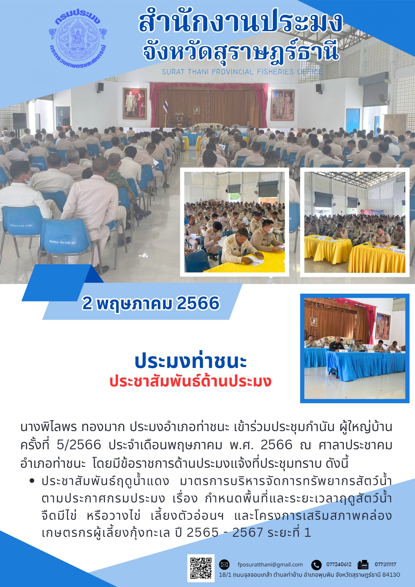 วันที่ 2 พฤษภาคม 2566 นางพิไลพร ทองมาก ประมงอำเภอท่าชนะ เข้าร่วมประชุมกำนัน ผู้ใหญ่บ้าน ครั้งที่ 5/2566 ประจำเดือน?พฤษภาคม? พ.ศ. 2566? ณ ศาลาประชาคมอำเภอท่าชนะ โดยมีข้อราชการด้านประมงแจ้งที่ประชุมทราบ ดังนี้