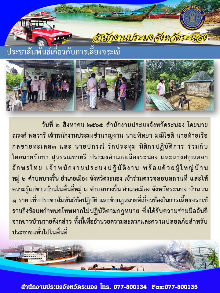 [2025-12-03] ระบบโปรแกรมประยุกต์ APD.. [2025-12-03] 5 ประโยชน์ หนังสือกำกับซื้อขายสัตว์น้ำ.. [2025-10-30] ประกาศจังหวัดระนอง เรื่อง ประกาศผู้ชนะการเสนอราคา ประกวดราคาซื้อวัสดุค.. [2025-10-29] ประกาศ ผู้ไม่มีผลประโยชน์ร่วมกัน ประกวดราคาซื้อครุภัณฑ์ยานพาหนะและขนส่.. [2025-10-08] งบทดลอง เดือนกันยายน 2568.. [2025-10-08] หมายเหตุประกอบงบการเงิน เดือนกันยายน 2568.. [2025-03-24] ประชาสัมพันธ์ ปิดอ่าวอันดามัน ฤดูสัตว์น้ำมีไข่ วางไข่ เลี้ยงตัวอ่อน.. [2024-11-05] ประกาศจังหวัดระนอง เรื่อง การขายทอดตลาดพัสดุ (ครุภัณฑ์ยานพาหนะและขนส่ง.. [2024-06-24] การประเมินคุณธรรมและความโปร่งใส (ผู้รับบริการ).. [2024-06-14] เตือน...เกษตรกรเฝ้าระวังโรคสัตว์น้ำในช่วงฤดูฝน.. อ่านทั้งหมด