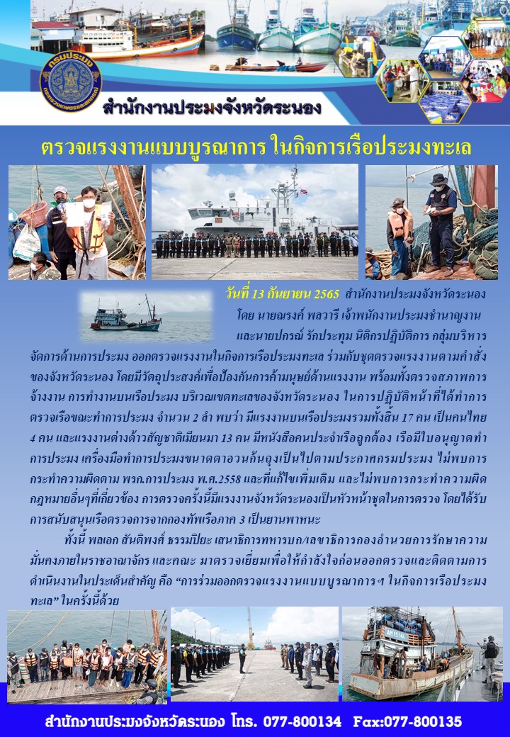 ตรวจแรงงานแบบบูรณาการ ในกิจการเรือประมงระนอง