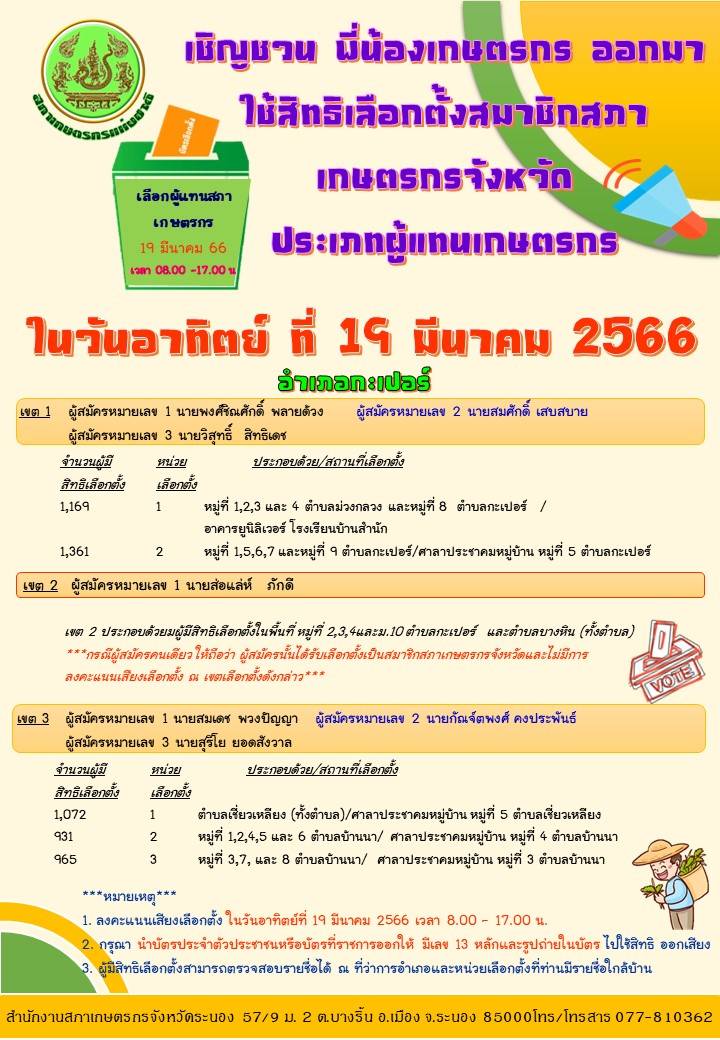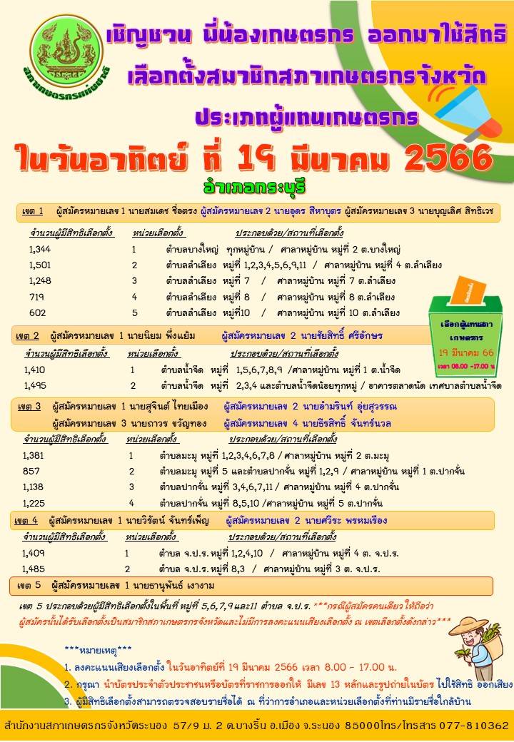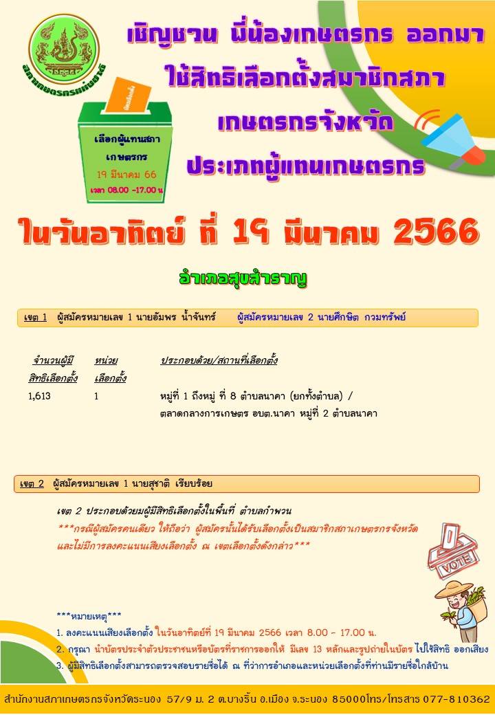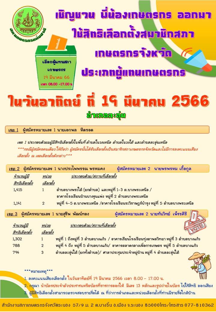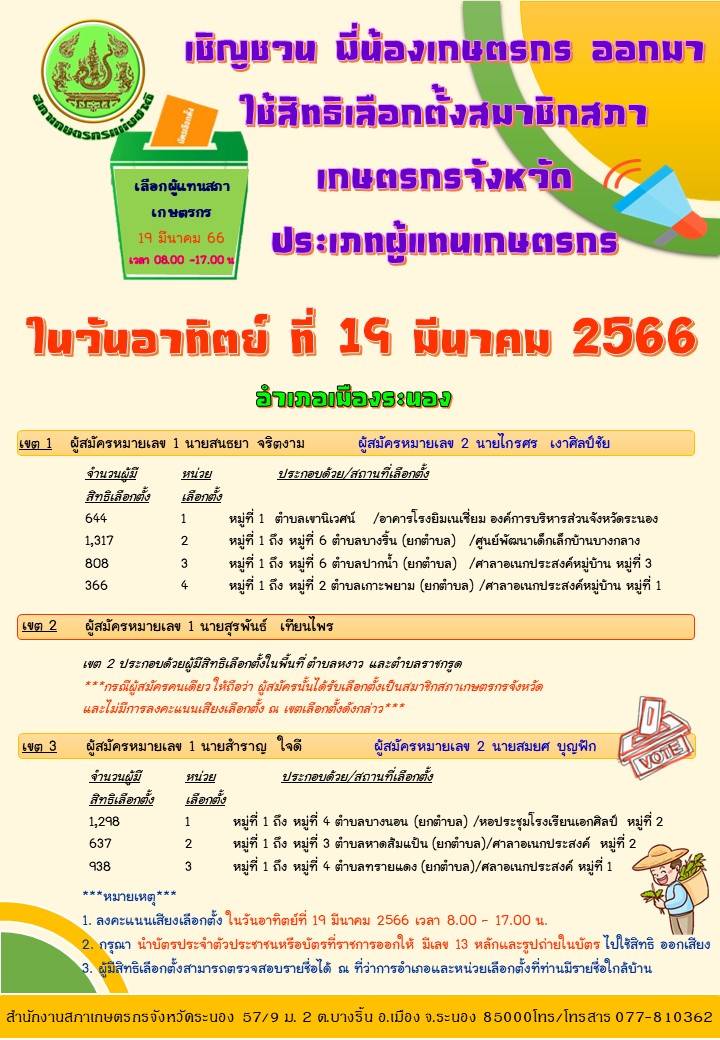 เชิญชวน พี่น้องเกษตรกร ออกมาใช้สิทธิ์เลือกตั้งสมาชิกสภาเกษตกรจังหวัดระนอง ประเภทผู้แทนเกษตกร