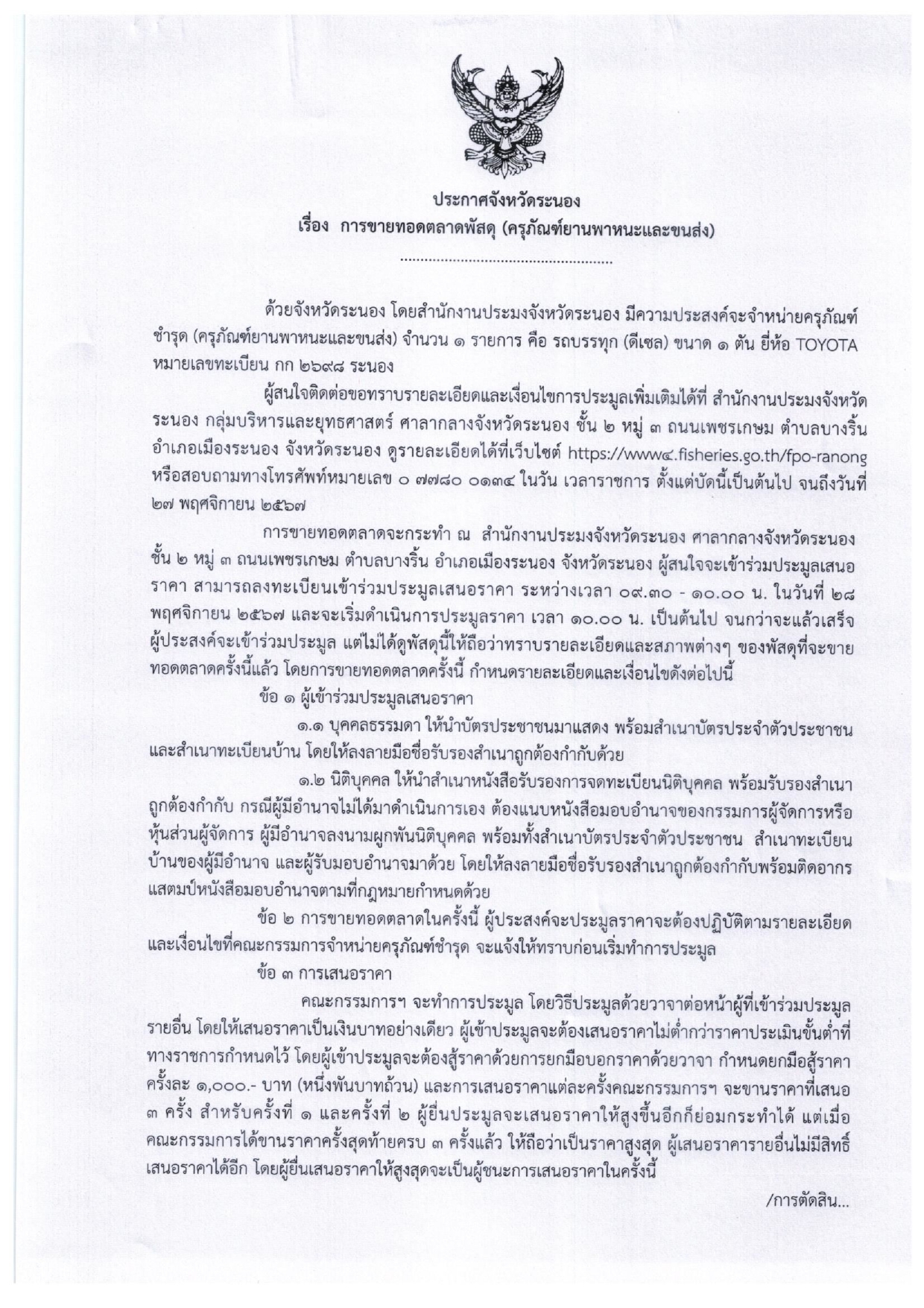ประกาศจังหวัดระนอง เรื่อง การขายทอดตลาดพัสดุ (ครุภัณฑ์ยานพาหนะและขนส่ง)