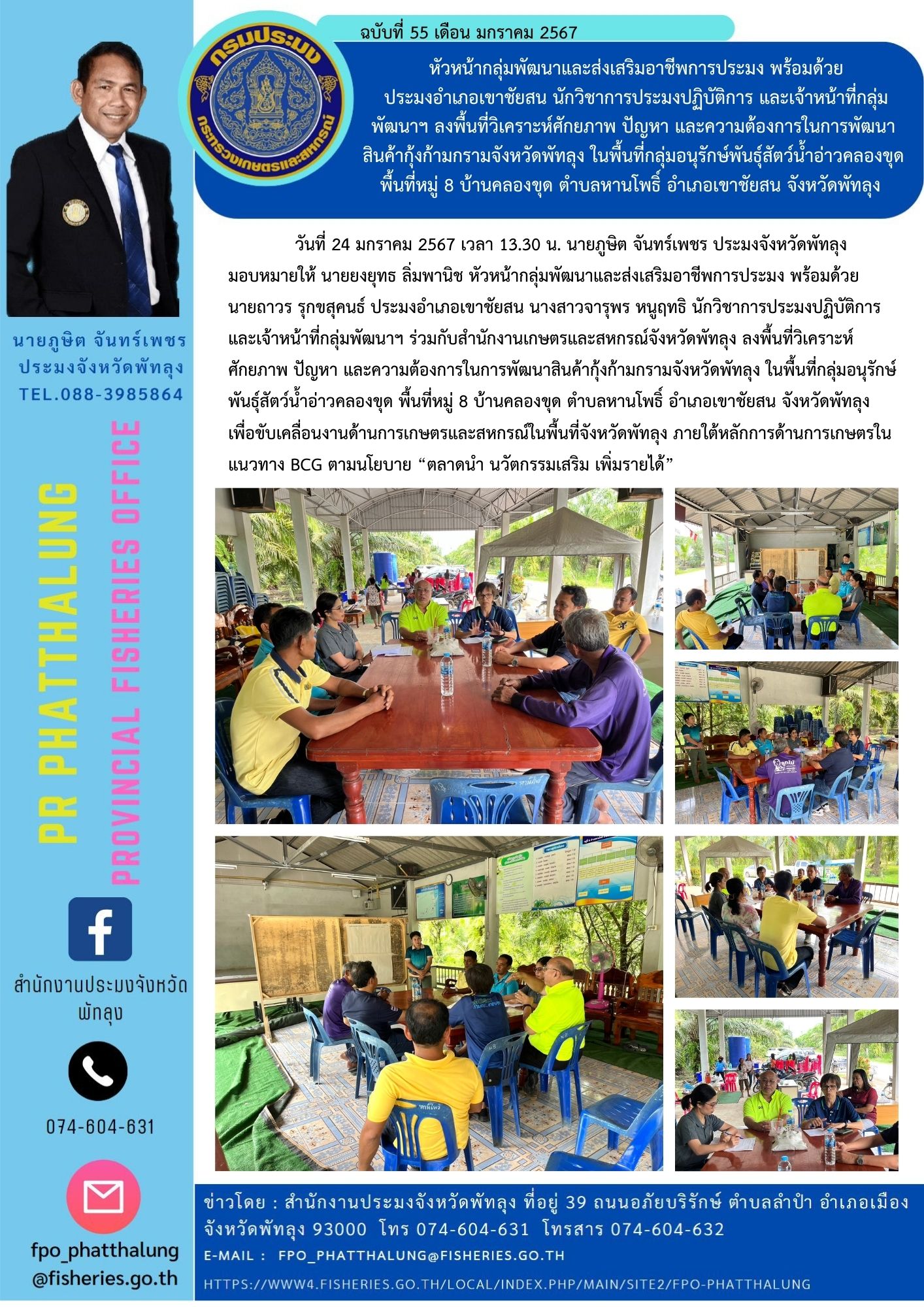 วันที่ 24 มกราคม 2567 เวลา 13.30 น. นายภูษิต จันทร์เพชร ประมงจังหวัดพัทลุง มอบหมายให้ นายยงยุทธ ลิ่มพานิช หัวหน้ากลุ่มพัฒนาและส่งเสริมอาชีพการประมง พร้อมด้วย นายถาวร รุกขสุคนธ์ ประมงอำเภอเขาชัยสน นางสาวจารุพร หนูฤทธิ นักวิชาการประมงปฏิบัติการ และเจ้าหน้าที่กลุ่มพัฒนาฯ ร่วมกับสำนักงานเกษตรและสหกรณ์จังหวัดพัทลุง ลงพื้นที่วิเคราะห์ศักยภาพ ปัญหา และความต้องการในการพัฒนาสินค้ากุ้งก้ามกรามจังหวัดพัทลุง ในพื้นที่กลุ่มอนุรักษ์พันธุ์สัตว์น้ำอ่าวคลองขุด พื้นที่หมู่ 8 บ้านคลองขุด ตำบลหานโพธิ์ อำเภอเขาชัยสน จังหวัดพัทลุง เพื่อขับเคลื่อนงานด้านการเกษตรและสหกรณ์ในพื้นที่จังหวัดพัทลุง ภายใต้หลักการด้านการเกษตรในแนวทาง BCG ตามนโยบาย “ตลาดนำ นวัตกรรมเสริม เพิ่มรายได้”