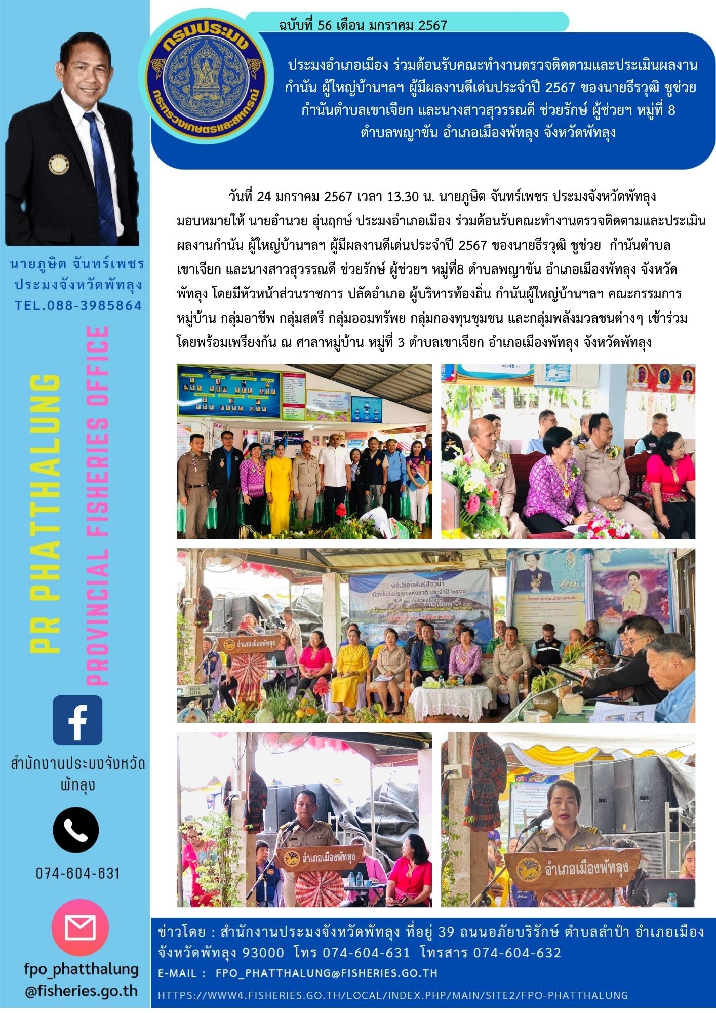 วันที่ 24 มกราคม 2567 เวลา 13.30 น. นายภูษิต จันทร์เพชร ประมงจังหวัดพัทลุง มอบหมายให้ นายอำนวย อุ่นฤกษ์ ประมงอำเภอเมือง ร่วมต้อนรับคณะทำงานตรวจติดตามและประเมินผลงานกำนัน ผู้ใหญ่บ้านฯลฯ ผู้มีผลงานดีเด่นประจำปี 2567 ของนายธีรวุฒิ ชูช่วย กำนันตำบล เขาเจียก และนางสาวสุวรรณดี ช่วยรักษ์ ผู้ช่วยฯ หมู่ที่8 ตำบลพญาขัน อำเภอเมืองพัทลุง จังหวัดพัทลุง โดยมีหัวหน้าส่วนราชการ ปลัดอำเภอ ผู้บริหารท้องถิ่น กำนันผู้ใหญ่บ้านฯลฯ คณะกรรมการหมู่บ้าน กลุ่มอาชีพ กลุ่มสตรี กลุ่มออมทรัพย กลุ่มกองทุนชุมชน และกลุ่มพลังมวลชนต่างๆ เข้าร่วมโดยพร้อมเพรียงกัน ณ ศาลาหมู่บ้าน หมู่ที่ 3 ตำบลเขาเจียก อำเภอเมืองพัทลุง จังหวัดพัทลุง