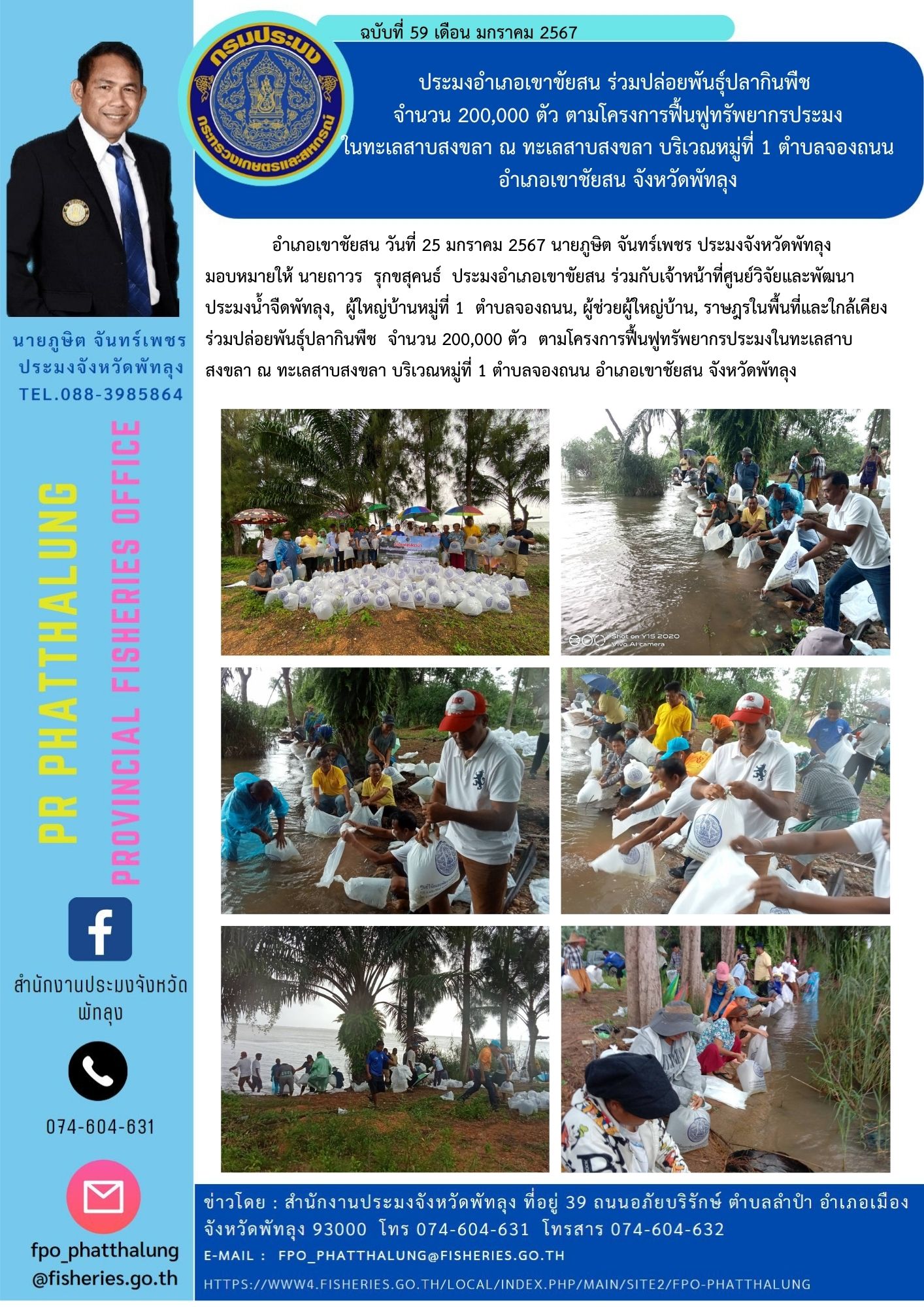 อำเภอเขาชัยสน วันที่ 25 มกราคม 2567 นายภูษิต จันทร์เพชร ประมงจังหวัดพัทลุง มอบหมายให้ นายถาวร รุกขสุคนธ์ ประมงอำเภอเขาขัยสน ร่วมกับเจ้าหน้าที่ศูนย์วิจัยและพัฒนาประมงน้ำจืดพัทลุง, ผู้ใหญ่บ้านหมู่ที่ 1 ตำบลจองถนน, ผู้ช่วยผู้ใหญ่บ้าน, ราษฎรในพื้นที่และใกล้เคียง ร่วมปล่อยพันธุ์ปลากินพืช จำนวน 200,000 ตัว ตามโครงการฟื้นฟูทรัพยากรประมงในทะเลสาบสงขลา ณ ทะเลสาบสงขลา บริเวณหมู่ที่ 1 ตำบลจองถนน อำเภอเขาชัยสน จังหวัดพัทลุง