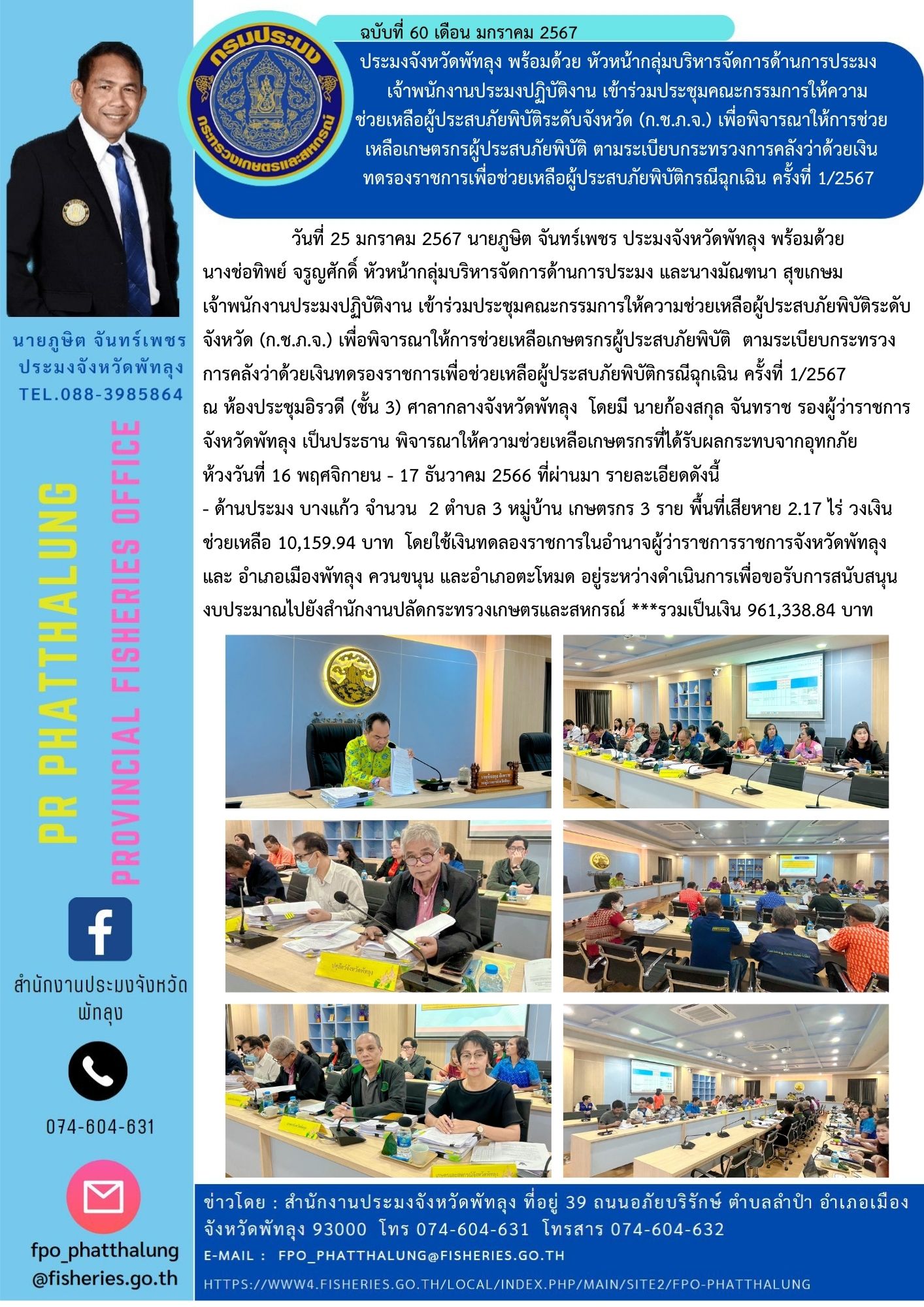 ประมงจังหวัดพัทลุง พร้อมด้วย หัวหน้ากลุ่มบริหารจัดการด้านการประมง เจ้าพนักงานประมงปฏิบัติงาน เข้าร่วมประชุมคณะกรรมการให้ความ ช่วยเหลือผู้ประสบภัยพิบัติระดับจังหวัด (ก.ช.ภ.จ.) เพื่อพิจารณาให้การช่วยเหลือเกษตรกรผู้ประสบภัยพิบัติ ตามระเบียบกระทรวงการคลังว่าด้วยเงินทดรองราชการเพื่อช่วยเหลือผู้ประสบภัยพิบัติกรณีฉุกเฉิน ครั้งที่ 1/2567