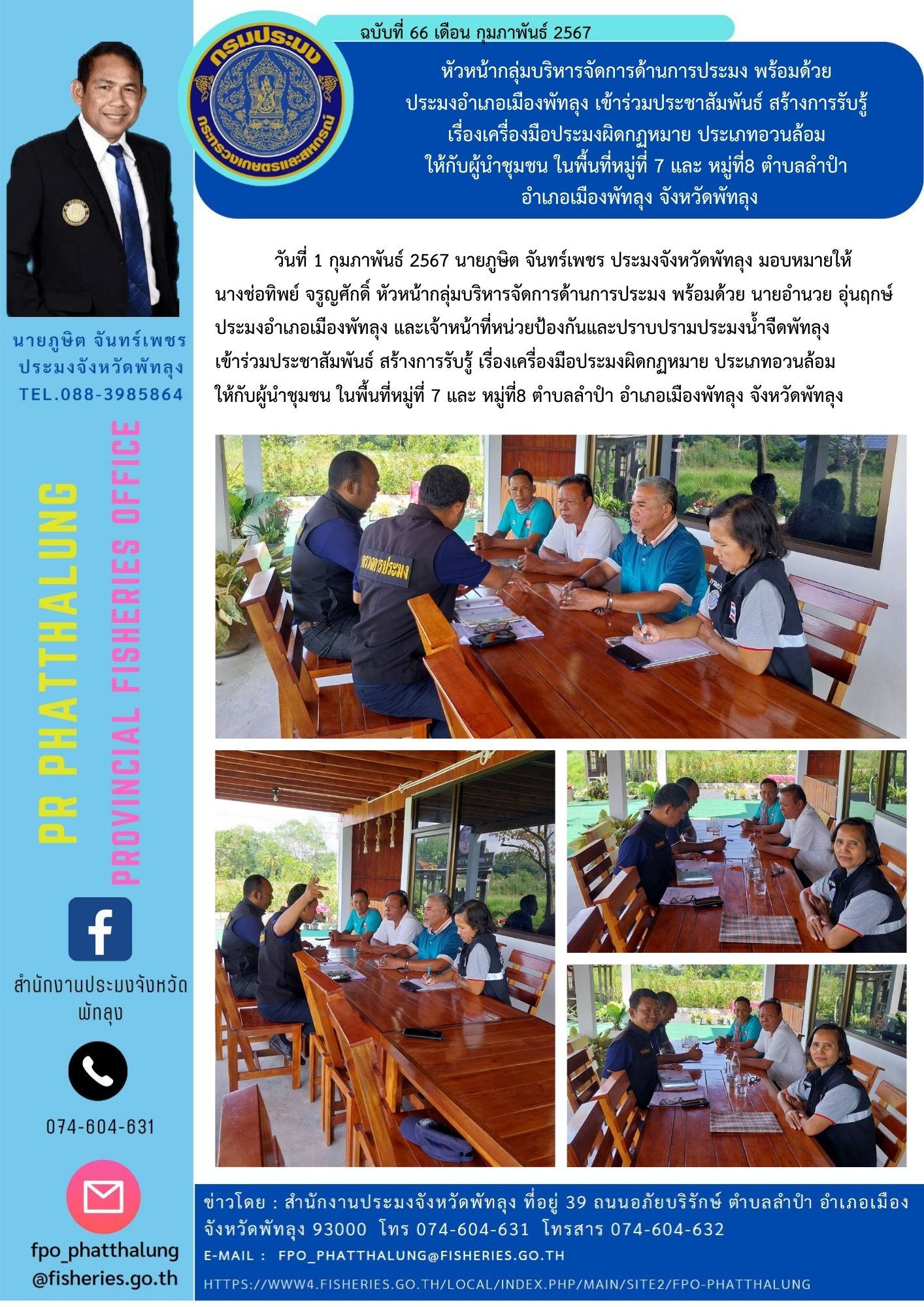 วันที่ 1 กุมภาพันธ์ 2567 นายภูษิต จันทร์เพชร ประมงจังหวัดพัทลุง มอบหมายให้ นางช่อทิพย์ จรูญศักดิ์ หัวหน้ากลุ่มบริหารจัดการด้านการประมง พร้อมด้วย นายอำนวย อุ่นฤกษ์ ประมงอำเภอเมืองพัทลุง และเจ้าหน้าที่หน่วยป้องกันและปราบปรามประมงน้ำจืดพัทลุง เข้าร่วมประชาสัมพันธ์ สร้างการรับรู้ เรื่องเครื่องมือประมงผิดกฏหมาย ประเภทอวนล้อม ให้กับผู้นำชุมชน ในพื้นที่หมู่ที่ 7 และ หมู่ที่8 ตำบลลำปำ อำเภอเมืองพัทลุง จังหวัดพัทลุง