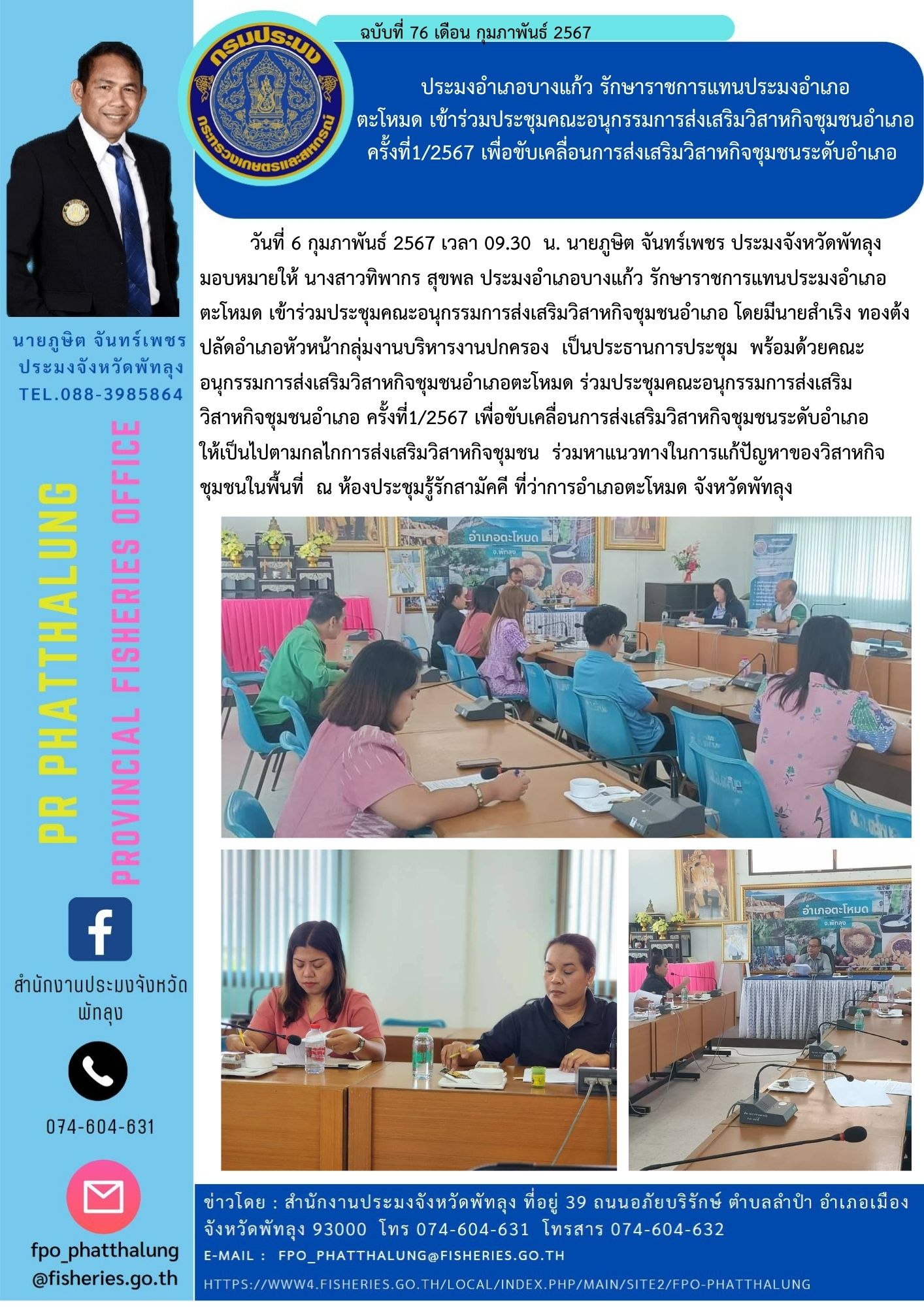 ประมงอำเภอบางแก้ว รักษาราชการแทนประมงอำเภอ ตะโหมด เข้าร่วมประชุมคณะอนุกรรมการส่งเสริมวิสาหกิจชุมชนอำเภอ ครั้งที่1/2567 เพื่อขับเคลื่อนการส่งเสริมวิสาหกิจชุมชนระดับอำเภอ