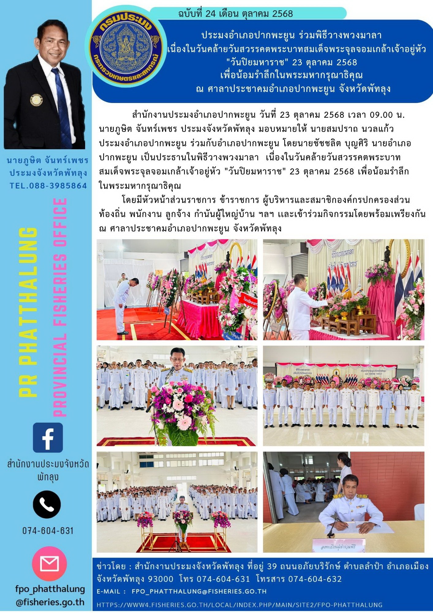 สำนักงานประมงอำเภอปากพะยูน วันที่ 23 ตุลาคม 2568 เวลา 09.00 น. นายภูษิต จันทร์เพชร ประมงจังหวัดพัทลุง มอบหมายให้ นายสมปราถ นวลแก้ว ประมงอำเภอปากพะยูน ร่วมกับอำเภอปากพะยูน โดยนายชัชชลิต บุญศิริ นายอำเภอปากพะยูน เป็นประธานในพิธีวางพวงมาลา เนื่องในวันคล้ายวันสวรรคตพระบาทสมเด็จพระจุลจอมเกล้าเจ้าอยู่หัว "วันปิยมหาราช" 23 ตุลาคม 2568 เพื่อน้อมรำลึกในพระมหากรุณาธิคุณ โดยมีหัวหน้าส่วนราชการ ข้าราชการ ผู้บริหารและสมาชิกองค์กรปกครองส่วนท้องถิ่น พนักงาน ลูกจ้าง กำนันผู้ใหญ่บ้าน ฯลฯ เเละเข้าร่วมกิจกรรมโดยพร้อมเพรียงกัน ณ ศาลาประชาคมอำเภอปากพะยูน จังหวัดพัทลุง