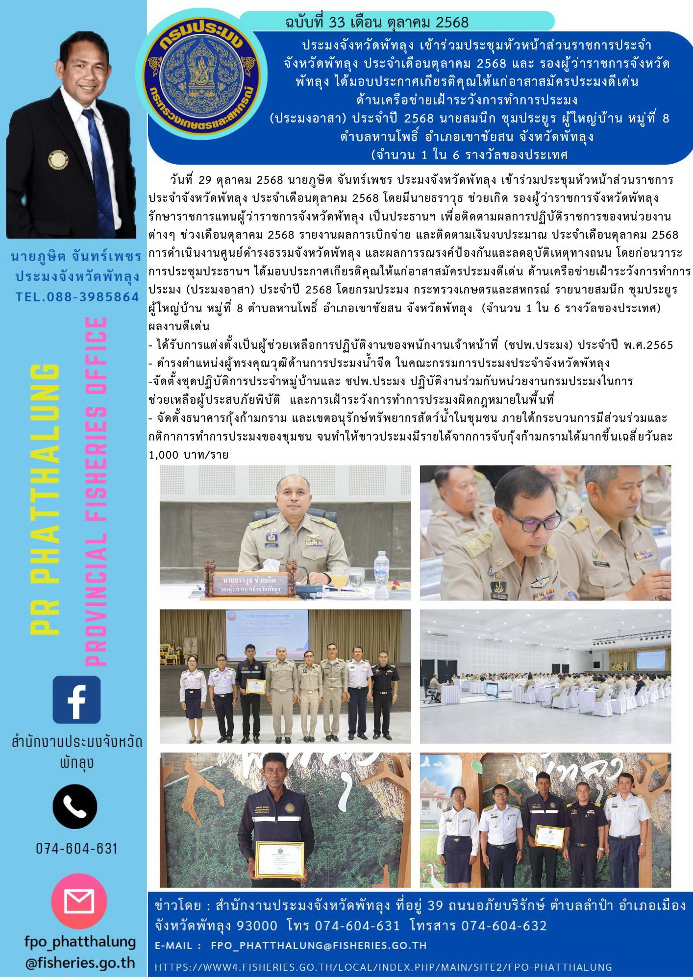 วันที่ 29 ตุลาคม 2568 นายภูษิต จันทร์เพชร ประมงจังหวัดพัทลุง เข้าร่วมประชุมหัวหน้าส่วนราชการประจำจังหวัดพัทลุง ประจำเดือนตุลาคม 2568 โดยมีนายธราวุธ ช่วยเกิด รองผู้ว่าราชการจังหวัดพัทลุงรักษาราชการแทนผู้ว่าราชการจังหวัดพัทลุง เป็นประธานฯ เพื่อติดตามผลการปฏิบัติราชการของหน่วยงานต่างๆ ช่วงเดือนตุลาคม 2568 รายงานผลการเบิกจ่าย และติดตามเงินงบประมาณ ประจำเดือนตุลาคม 2568 การดำเนินงานศูนย์ดำรงธรรมจังหวัดพัทลุง และผลการรณรงค์ป้องกันและลดอุบัติเหตุทางถนน โดยก่อนวาระการประชุมประธานฯ ได้มอบประกาศเกียรติคุณให้แก่อาสาสมัครประมงดีเด่น ด้านเครือข่ายเฝ้าระวังการทำการประมง (ประมงอาสา) ประจำปี 2568 โดยกรมประมง กระทรวงเกษตรและสหกรณ์ รายนายสมนึก ชุมประยูร ผู้ใหญ่บ้าน หมู่ที่ 8 ตำบลหานโพธิ์ อำเภอเขาชัยสน จังหวัดพัทลุง (จำนวน 1 ใน 6 รางวัลของประเทศ) ผลงานดีเด่น