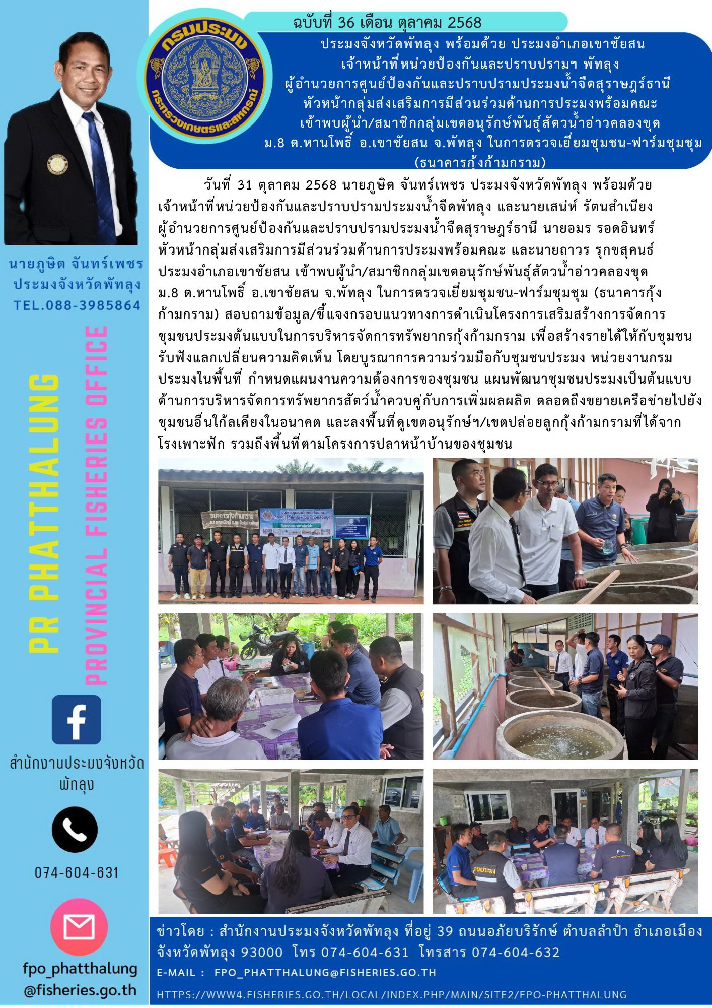 วันที่ 31 ตุลาคม 2568 นายภูษิต จันทร์เพชร ประมงจังหวัดพัทลุง พร้อมด้วย เจ้าหน้าที่หน่วยป้องกันและปราบปรามประมงน้ำจืดพัทลุง และนายเสน่ห์ รัตนสำเนียง ผู้อำนวยการศูนย์ป้องกันและปราบปรามประมงน้ำจืดสุราษฎร์ธานี นายอมร รอดอินทร์ หัวหน้ากลุ่มส่งเสริมการมีส่วนร่วมด้านการประมงพร้อมคณะ และนายถาวร รุกขสุคนธ์ ประมงอำเภอเขาชัยสน เข้าพบผู้นำ/สมาชิกกลุ่มเขตอนุรักษ์พันธุ์สัตวน้ำอ่าวคลองขุด ม.8 ต.หานโพธิ์ อ.เขาชัยสน จ.พัทลุง ในการตรวจเยี่ยมชุมชน-ฟาร์มชุมชุม (ธนาคารกุ้งก้ามกราม) สอบถามข้อมูล/ชี้แจงกรอบแนวทางการดําเนินโครงการเสริมสร้างการจัดการชุมชนประมงต้นแบบในการบริหารจัดการทรัพยากรกุ้งก้ามกราม เพื่อสร้างรายได้ให้กับชุมชน รับฟังแลกเปลี่ยนความคิดเห็น โดยบูรณาการความร่วมมือกับชุมชนประมง หน่วยงานกรมประมงในพื้นที่ กําหนดแผนงานความต้องการของชุมชน แผนพัฒนาชุมชนประมงเป็นต้นแบบด้านการบริหารจัดการทรัพยากรสัตว์น้ำควบคู่กับการเพิ่มผลผลิต ตลอดถึงขยายเครือข่ายไปยังชุมชนอื่นใก้ลเคียงในอนาคต และลงพื้นที่ดูเขตอนุรักษ์ฯ/เขตปล่อยลูกกุ้งก้ามกรามที่ได้จากโรงเพาะฟัก รวมถึงพื้นที่ตามโครงการปลาหน้าบ้านของชุมชน