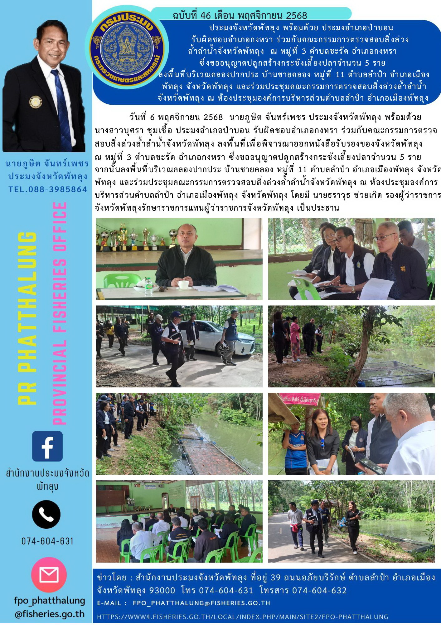 วันที่ 6 พฤศจิกายน 2568 นายภูษิต จันทร์เพชร ประมงจังหวัดพัทลุง พร้อมด้วยนางสาวบุศรา ชุมเชื้อ ประมงอำเภอป่าบอน รับผิดชอบอำเภอกงหรา ร่วมกับคณะกรรมการตรวจสอบสิ่งล่วงล้ำลำน้ำจังหวัดพัทลุง ลงพื้นที่เพื่อพิจารณาออกหนังสือรับรองของจังหวัดพัทลุง ณ หมู่ที่ 3 ตำบลชะรัด อำเภอกงหรา ซึ่งขออนุญาตปลูกสร้างกระชังเลี้ยงปลาจำนวน 5 ราย
