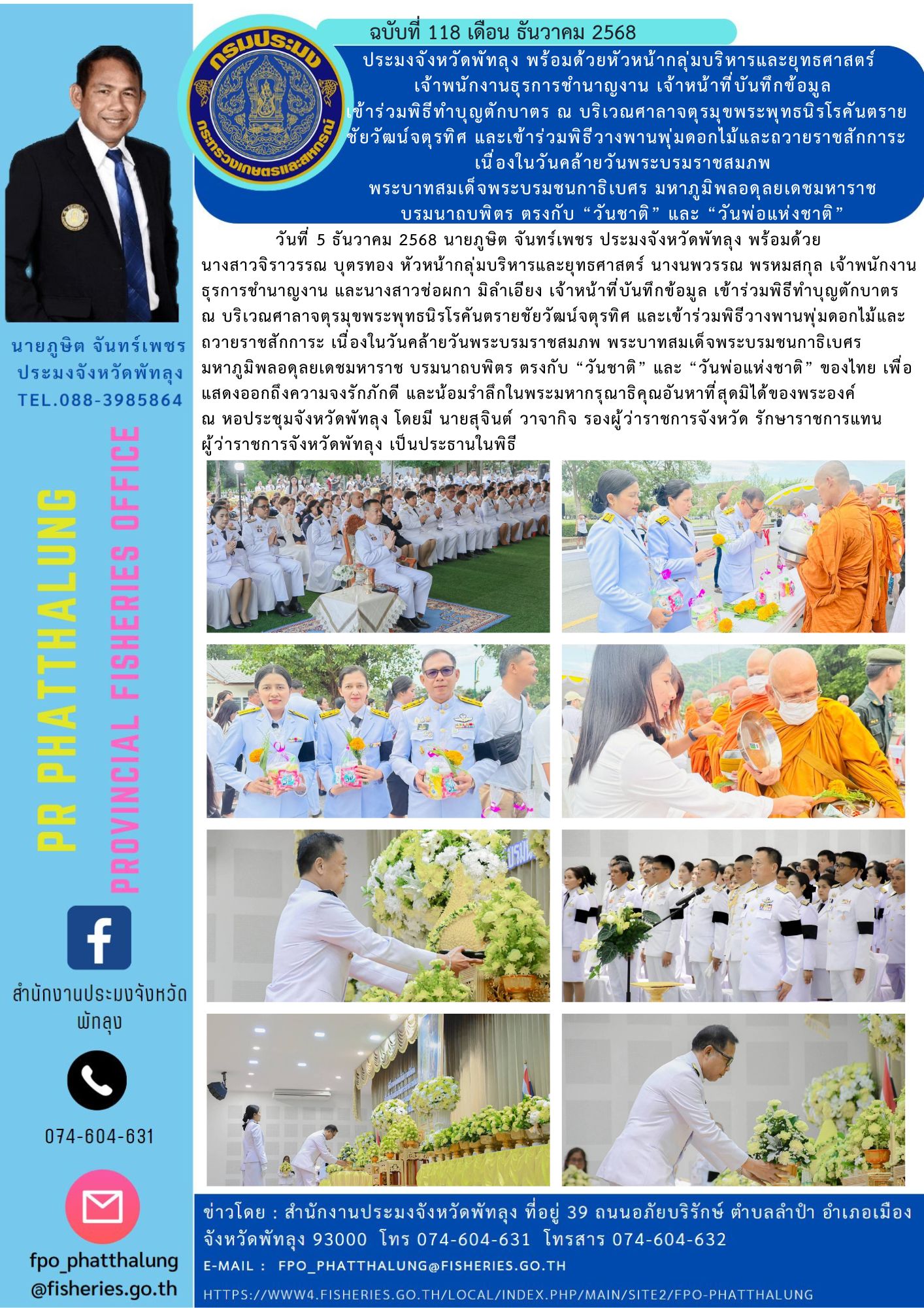 วันที่ 5 ธันวาคม 2568 นายภูษิต จันทร์เพชร ประมงจังหวัดพัทลุง พร้อมด้วย นางสาวจิราวรรณ บุตรทอง หัวหน้ากลุ่มบริหารและยุทธศาสตร์ นางนพวรรณ พรหมสกุล เจ้าพนักงานธุรการชำนาญงาน และนางสาวช่อผกา มิลำเอียง เจ้าหน้าที่บันทึกข้อมูล เข้าร่วมพิธีทำบุญตักบาตร ณ บริเวณศาลาจตุรมุขพระพุทธนิรโรคันตรายชัยวัฒน์จตุรทิศ และเข้าร่วมพิธีวางพานพุ่มดอกไม้และถวายราชสักการะ เนื่องในวันคล้ายวันพระบรมราชสมภพ พระบาทสมเด็จพระบรมชนกาธิเบศรมหาภูมิพลอดุลยเดชมหาราช บรมนาถบพิตร ตรงกับ “วันชาติ” และ “วันพ่อแห่งชาติ” ของไทย เพื่อแสดงออกถึงความจงรักภักดี และน้อมรำลึกในพระมหากรุณาธิคุณอันหาที่สุดมิได้ของพระองค์ ณ หอประชุมจังหวัดพัทลุง โดยมี นายสุจินต์ วาจากิจ รองผู้ว่าราชการจังหวัด รักษาราชการแทน
