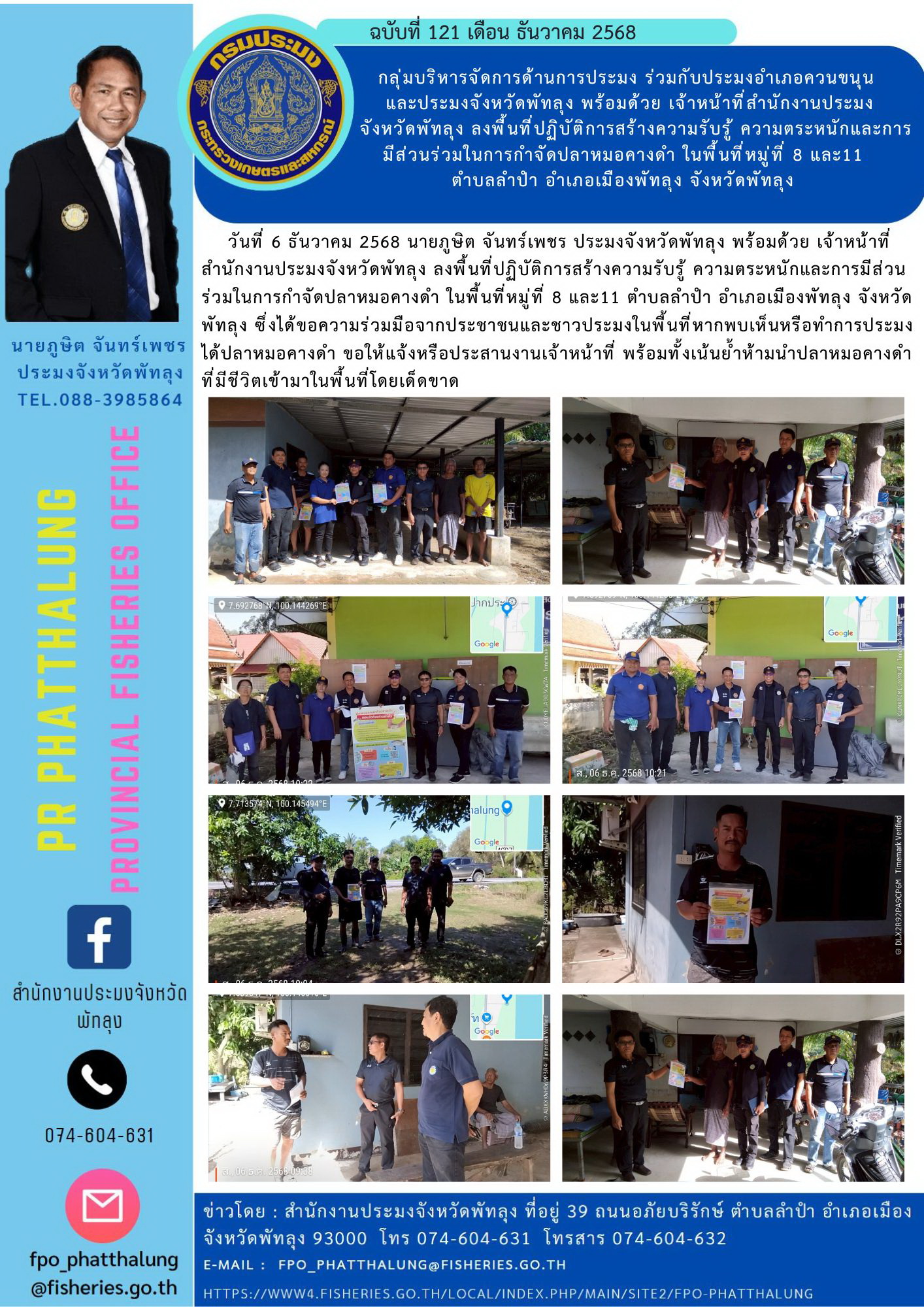 วันที่ 6 ธันวาคม 2568 นายภูษิต จันทร์เพชร ประมงจังหวัดพัทลุง พร้อมด้วย เจ้าหน้าที่สำนักงานประมงจังหวัดพัทลุง ลงพื้นที่ปฏิบัติการสร้างความรับรู้ ความตระหนักและการมีส่วนร่วมในการกำจัดปลาหมอคางดำ ในพื้นที่หมู่ที่ 8 และ11 ตำบลลำปำ อำเภอเมืองพัทลุง จังหวัดพัทลุง ซึ่งได้ขอความร่วมมือจากประชาชนและชาวประมงในพื้นที่หากพบเห็นหรือทำการประมงได้ปลาหมอคางดำ ขอให้แจ้งหรือประสานงานเจ้าหน้าที่ พร้อมทั้งเน้นย้ำห้ามนำปลาหมอคางดำที่มีชีวิตเข้ามาในพื้นที่โดยเด็ดขาด