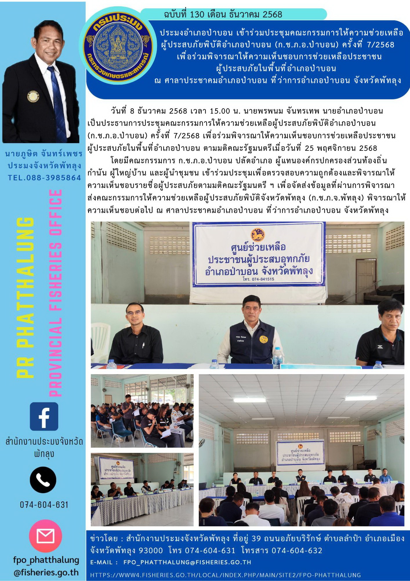 ประมงอำเภอป่าบอน เข้าร่วมประชุมคณะกรรมการให้ความช่วยเหลือผู้ประสบภัยพิบัติอำเภอป่าบอน (ก.ช.ภ.อ.ป่าบอน) ครั้งที่ 7/2568 เพื่อร่วมพิจารณาให้ความเห็นชอบการช่วยเหลือประชาชน ผู้ประสบภัยในพื้นที่อำเภอป่าบอน ณ ศาลาประชาคมอำเภอป่าบอน ที่ว่าการอำเภอป่าบอน จังหวัดพัทลุง