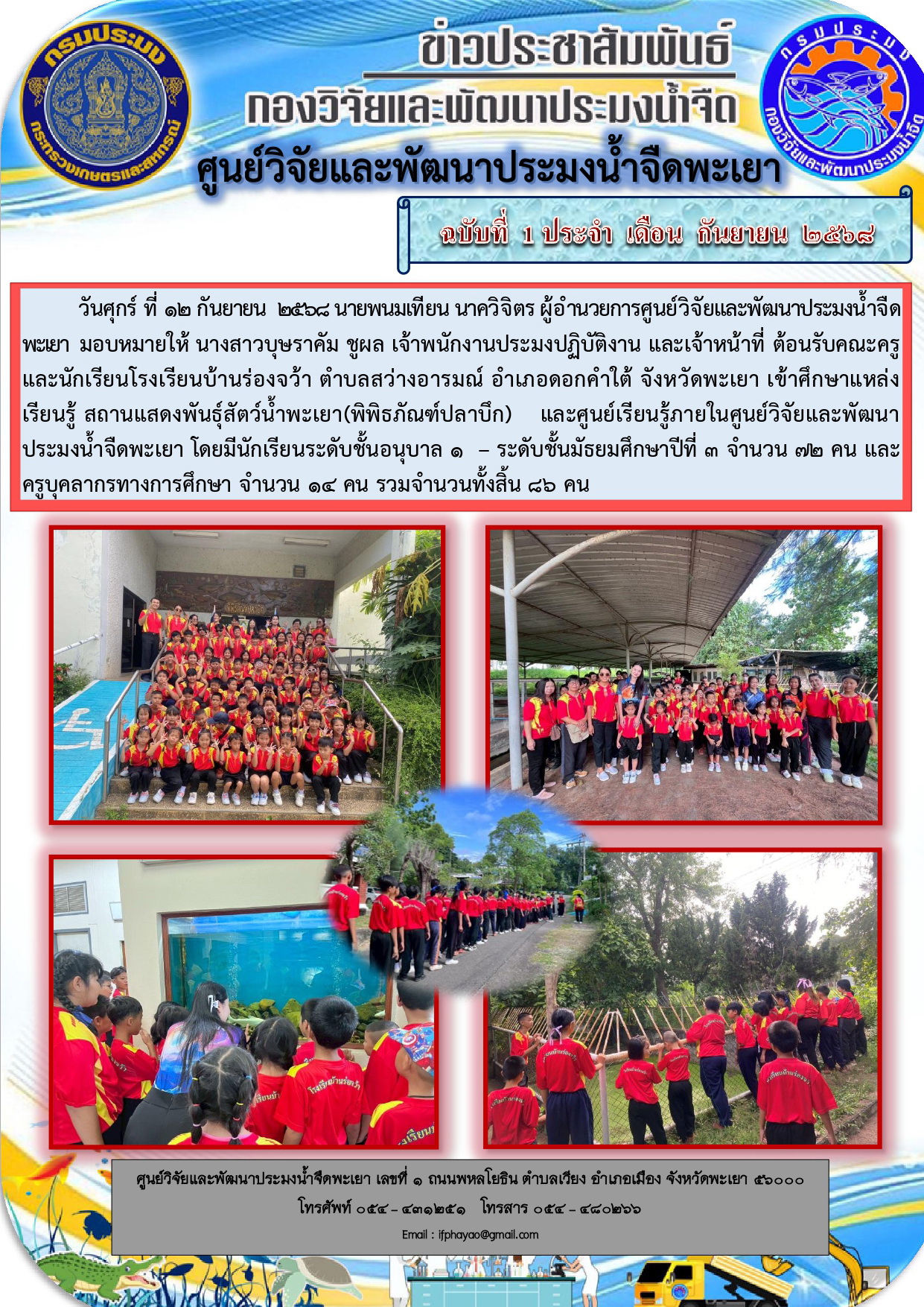 วันศุกร์ ที่ 12 กันยายน  2568 นายพนมเทียน นาควิจิตร ผู้อำนวยการศูนย์วิจัยและพัฒนาประมงน้ำจืดพะเยา  มอบหมายให้ นางสาวบุษราคัม ชูผล เจ้าพนักงานประมงปฏิบัติงาน และเจ้าหน้าที่ ต้อนรับคณะครูและนักเรียนโรงเรียนบ้านร่องจว้า ตำบลสว่างอารมณ์ อำเภอดอกคำใต้ จังหวัดพะเยา เข้าศึกษาแหล่งเรียนรู้ สถานแสดงพันธุ์สัตว์น้ำพะเยา(พิพิธภัณฑ์ปลาบึก) และศูนย์เรียนรู้ภายในศูนย์วิจัยและพัฒนาประมงน้ำจืดพะเยา โดยมีนักเรียนระดับชั้นอนุบาล 1  – ระดับชั้นมัธยมศึกษาปีที่ 3 จำนวน 72 คน และครูบุคลากรทางการศึกษา จำนวน 14 คน รวมจำนวนทั้งสิ้น 86 วันศุกร์ ที่ 12 กันยายน  2568 นายพนมเทียน นาควิจิตร ผู้อำนวยการศูนย์วิจัยและพัฒนาประมงน้ำจืดพะเยา  มอบหมายให้ นางสาวบุษราคัม ชูผล เจ้าพนักงานประมงปฏิบัติงาน และเจ้าหน้าที่ ต้อนรับคณะครูและนักเรียนโรงเรียนบ้านร่องจว้า ตำบลสว่างอารมณ์ อำเภอดอกคำใต้ จังหวัดพะเยา เข้าศึกษาแหล่งเรียนรู้ สถานแสดงพันธุ์สัตว์น้ำพะเยา(พิพิธภัณฑ์ปลาบึก) และศูนย์เรียนรู้ภายในศูนย์วิจัยและพัฒนาประมงน้ำจืดพะเยา โดยมีนักเรียนระดับชั้นอนุบาล 1  – ระดับชั้นมัธยมศึกษาปีที่ 3 จำนวน 72 คน และครูบุคลากรทางการศึกษา จำนวน 14 คน รวมจำนวนทั้งสิ้น 86 คน