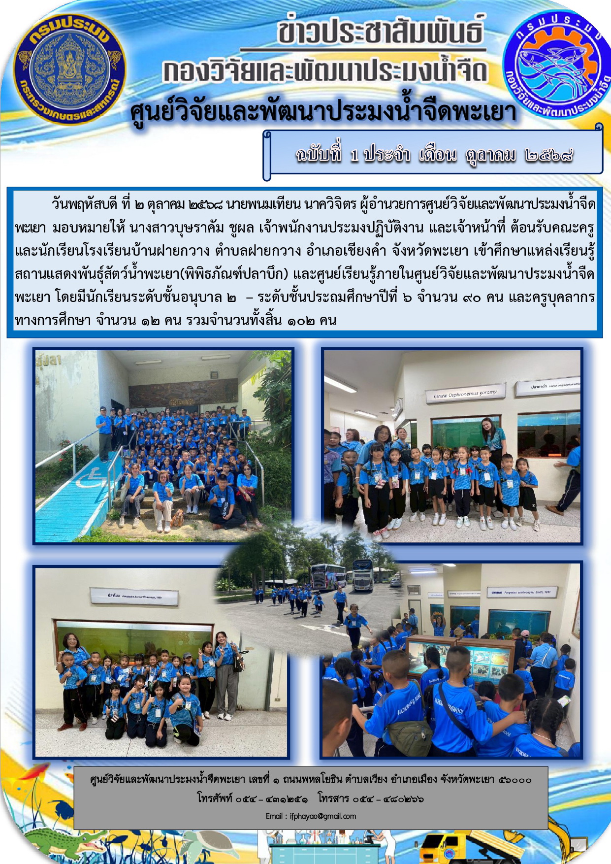 วันพฤหัสบดี ที่ 2 ตุลาคม 2568 นายพนมเทียน นาควิจิตร ผู้อำนวยการศูนย์วิจัยและพัฒนาประมงน้ำจืดพะเยา  มอบหมายให้ นางสาวบุษราคัม ชูผล เจ้าพนักงานประมงปฏิบัติงาน และเจ้าหน้าที่ ต้อนรับคณะครูและนักเรียนโรงเรียนบ้านฝายกวาง ตำบลฝายกวาง อำเภอเชียงคำ จังหวัดพะเยา เข้าศึกษาแหล่งเรียนรู้ สถานแสดงพันธุ์สัตว์น้ำพะเยา(พิพิธภัณฑ์ปลาบึก) และศูนย์เรียนรู้ภายในศูนย์วิจัยและพัฒนาประมงน้ำจืดพะเยา โดยมีนักเรียนระดับชั้นอนุบาล 2  – ระดับชั้นประถมศึกษาปีที่ 6 จำนวน 90 คน และครูบุคลากรทางการศึกษา จำนวน 12 คน รวมจำนวนทั้งสิ้น 102 คน