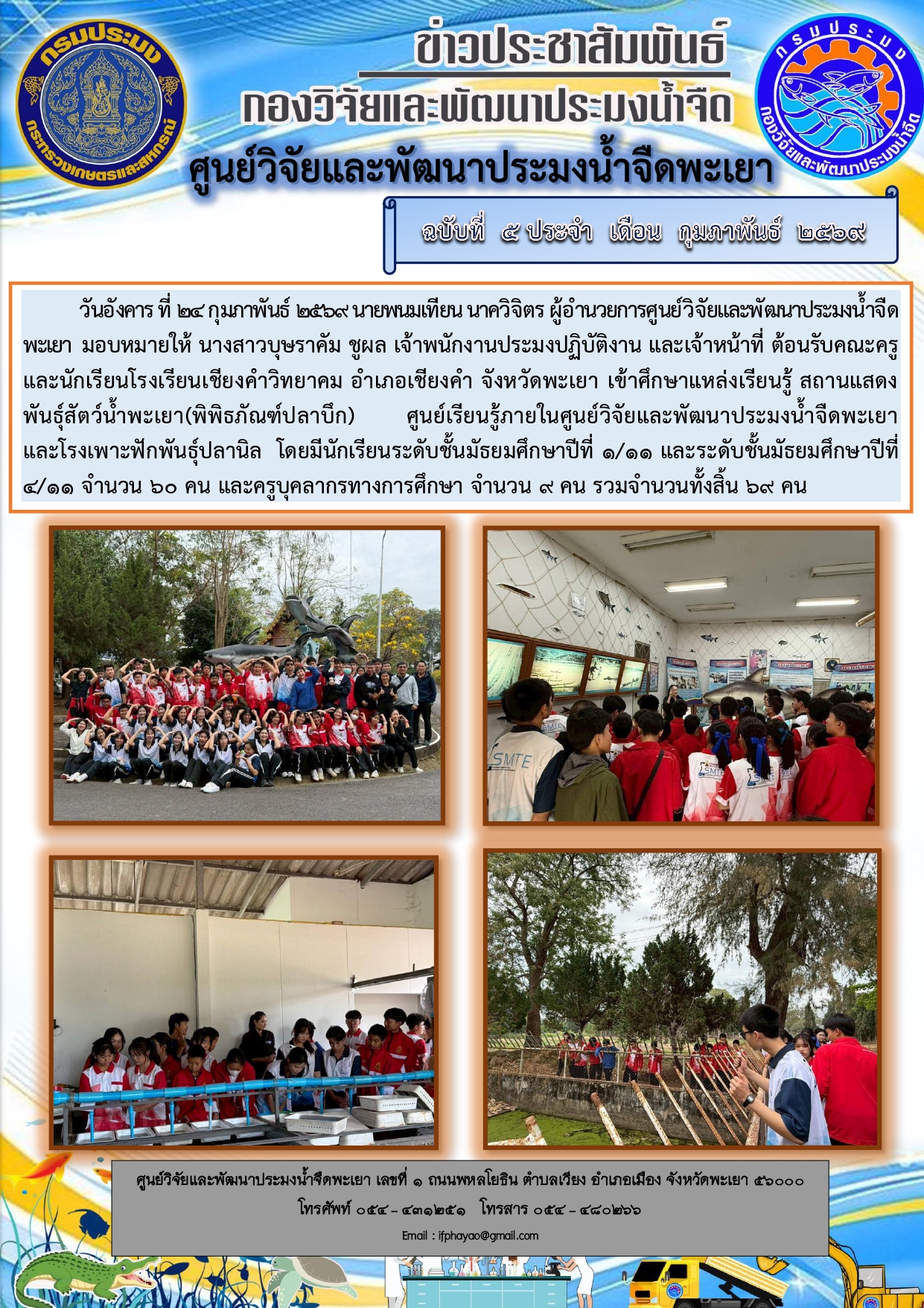 วันอังคาร ที่ 24 กุมภาพันธ์ 2569 นายพนมเทียน นาควิจิตร ผู้อำนวยการศูนย์วิจัยและพัฒนาประมงน้ำจืดพะเยา มอบหมายให้ นางสาวบุษราคัม ชูผล เจ้าพนักงานประมงปฏิบัติงาน และเจ้าหน้าที่ ต้อนรับคณะครูและนักเรียนโรงเรียนเชียงคำวิทยาคม อำเภอเชียงคำ จังหวัดพะเยา เข้าศึกษาแหล่งเรียนรู้ สถานแสดงพันธุ์สัตว์น้ำพะเยา(พิพิธภัณฑ์ปลาบึก) ศูนย์เรียนรู้ภายในศูนย์วิจัยและพัฒนาประมงน้ำจืดพะเยา และโรงเพาะฟักพันธุ์ปลานิล โดยมีนักเรียนระดับชั้นมัธยมศึกษาปีที่ 1/11 และระดับชั้นมัธยมศึกษาปีที่ 4/11 จำนวน 60 คน และครูบุคลากรทางการศึกษา จำนวน 9 คน รวมจำนวนทั้งสิ้น 69 คน