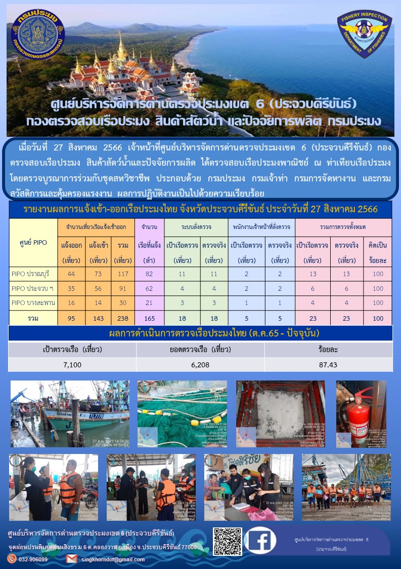 เมื่อวันที่ 27 สิงหาคม 2566 เจ้าหน้าที่ศูนย์บริหารจัดการด่านตรวจประมงเขต 6 (ประจวบคีรีขันธ์) ได้ตรวจสอบเรือประมงพาณิชย์ ณ ท่าเทียบเร..