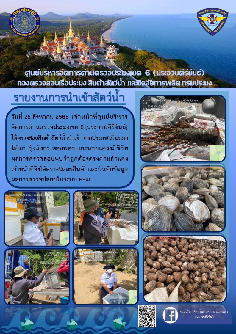 วันที่ 29 สิงหาคม 2566 เจ้าหน้าที่ศูนย์บริหารจัดการด่านตรวจประมงเขต 6 (ประจวบคีรีขันธ์) ได้ตรวจสอบสินค้าสัตว์น้ำนำเข้าจากประเทศเมียนมา ได..