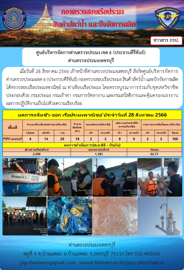 เมื่อวันที่ 28 สิงหาคม 2566 เจ้าหน้าที่ด่านตรวจประมงเพชรบุรี สังกัดศูนย์บริหารจัดการด่านตรวจประมงเขต 6 (ประจวบคีรีขันธ์) กองตรว..