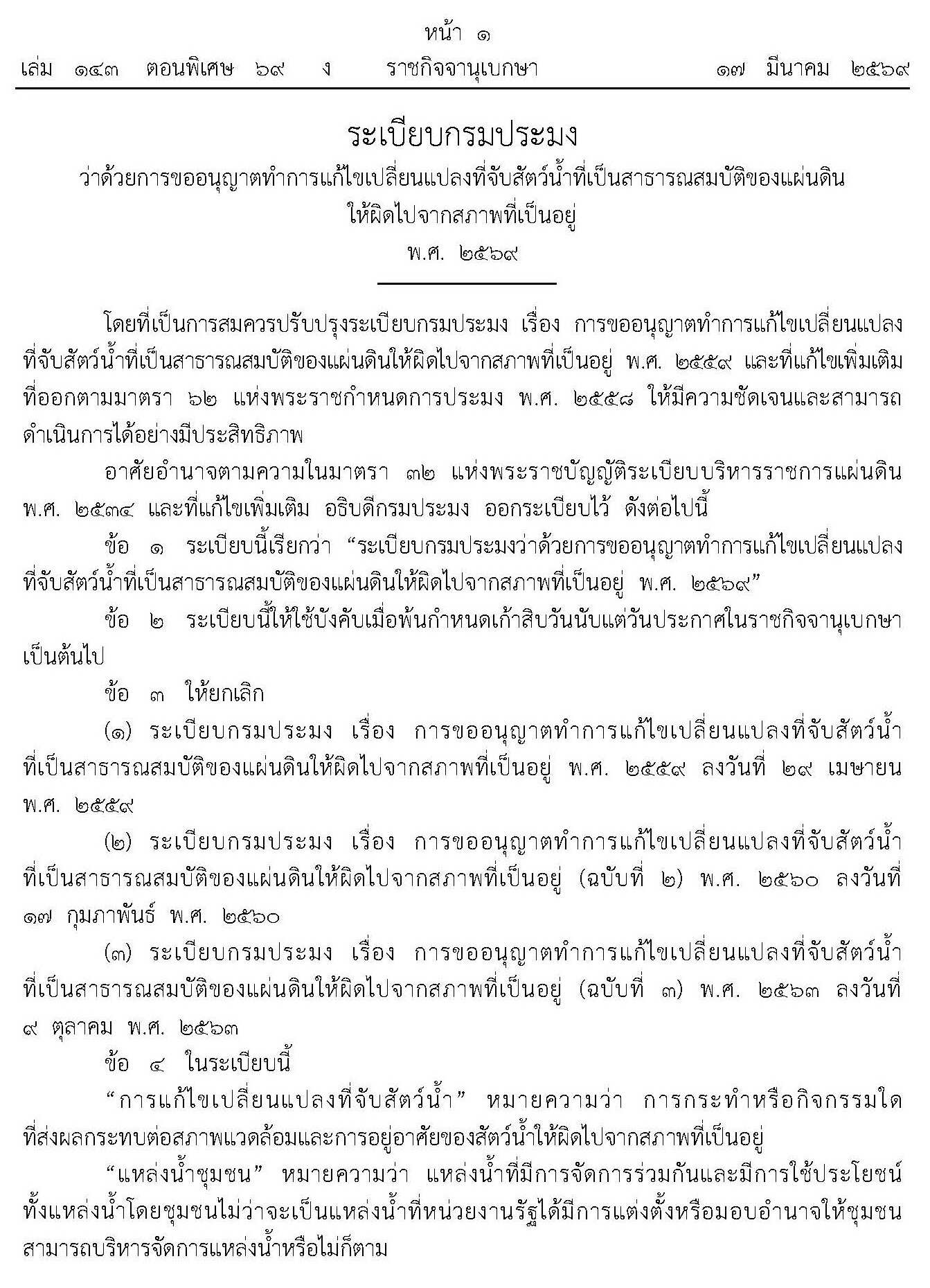 ระเบียบกรมประมงว่าด้วยการขออนุญาตทำการแก้ไขเปลี่ยนแปลงที่จับสัตว์น้ำที่เป็นสาธารณสมบัติของแผ่นดินให้ผิดไปจากสภาพที่เป็นอยู่ พ.ศ. 2569