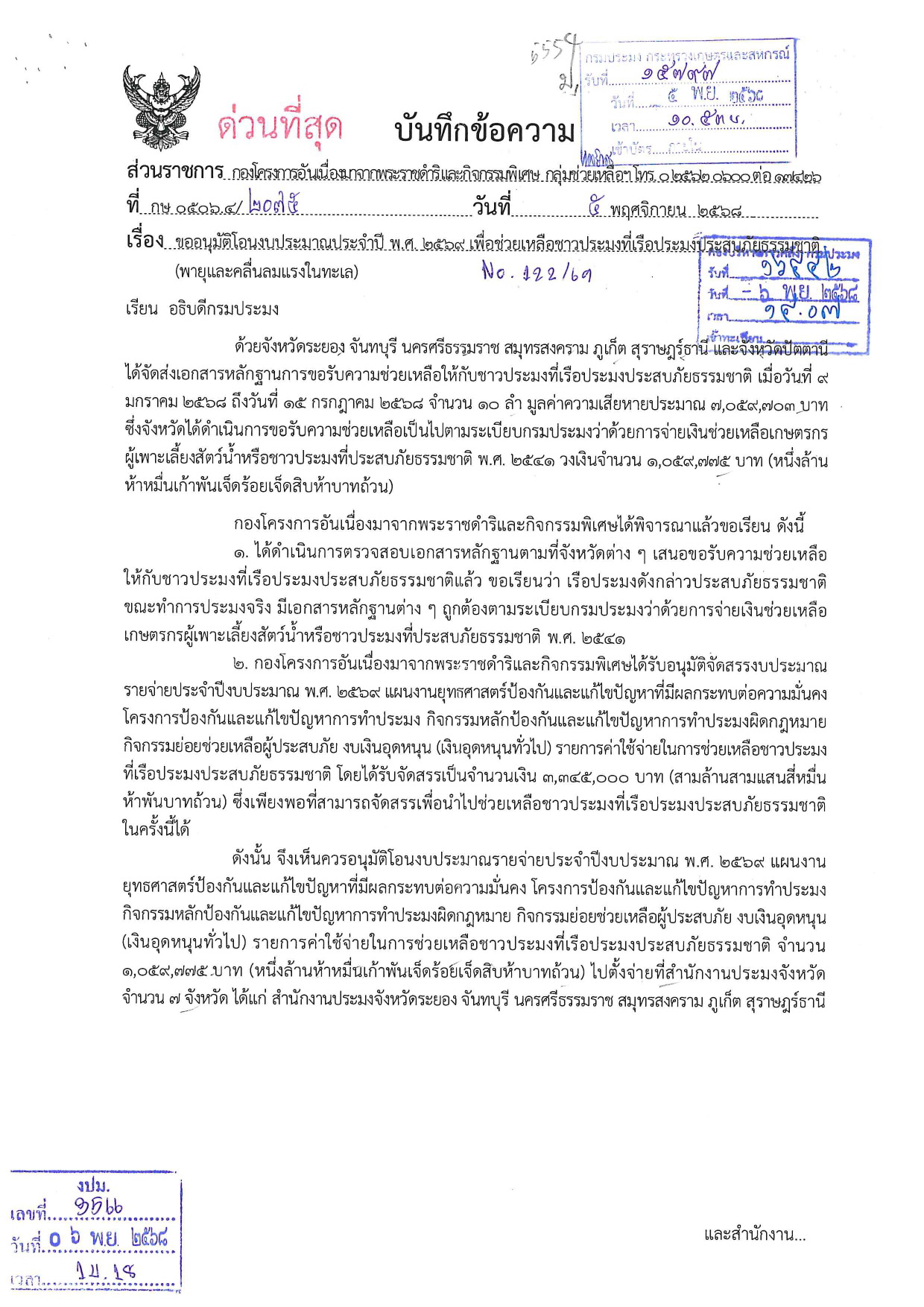 กรมประมง ได้อนุมัติโอนงบประมาณรายจ่ายประจำปีงบประมาณ พ.ศ. 2569 รายการค่าใช้จ่ายในการช่วยเหลือเกษตรกรผู้เพาะเลี้ยงสัตว์น้ำและชาวประมงที่ประสบภัย จำนวนเงิน 1,059,775 บาท (หนึ่งล้านห้าหมื่นเก้าพันเจ็ดร้อยเจ็ดสิบห้าบาทถ้วน) ไปตั้งจ่ายที่สำนักงานประมงจังหวัด จำนวน 7 จังหวัด ได้แก่ สำนักงานประมงจังหวัดระยอง จันทบุรี นครศรีธรรมราช สมุทรสงคราม ภูเก็ต สุราษฎร์ธานี และสำนักงานประมงจังหวัดปัตตานี เป็นที่เรียบร้อยแล้ว ดังนั้น จึงขอให้จังหวัดเร่งดำเนินการจ่ายเงินช่วยเหลือให้กับชาวประมงที่เรือประมงประสบภัยธรรมชาติ ให้แล้วเสร็จโดยเร็วที่สุด พร้อมรายงานผลการจ่ายให้กรมประมงทราบ รายละเอียดตามสิ่งที่ส่งมาด้วย 1 - 13