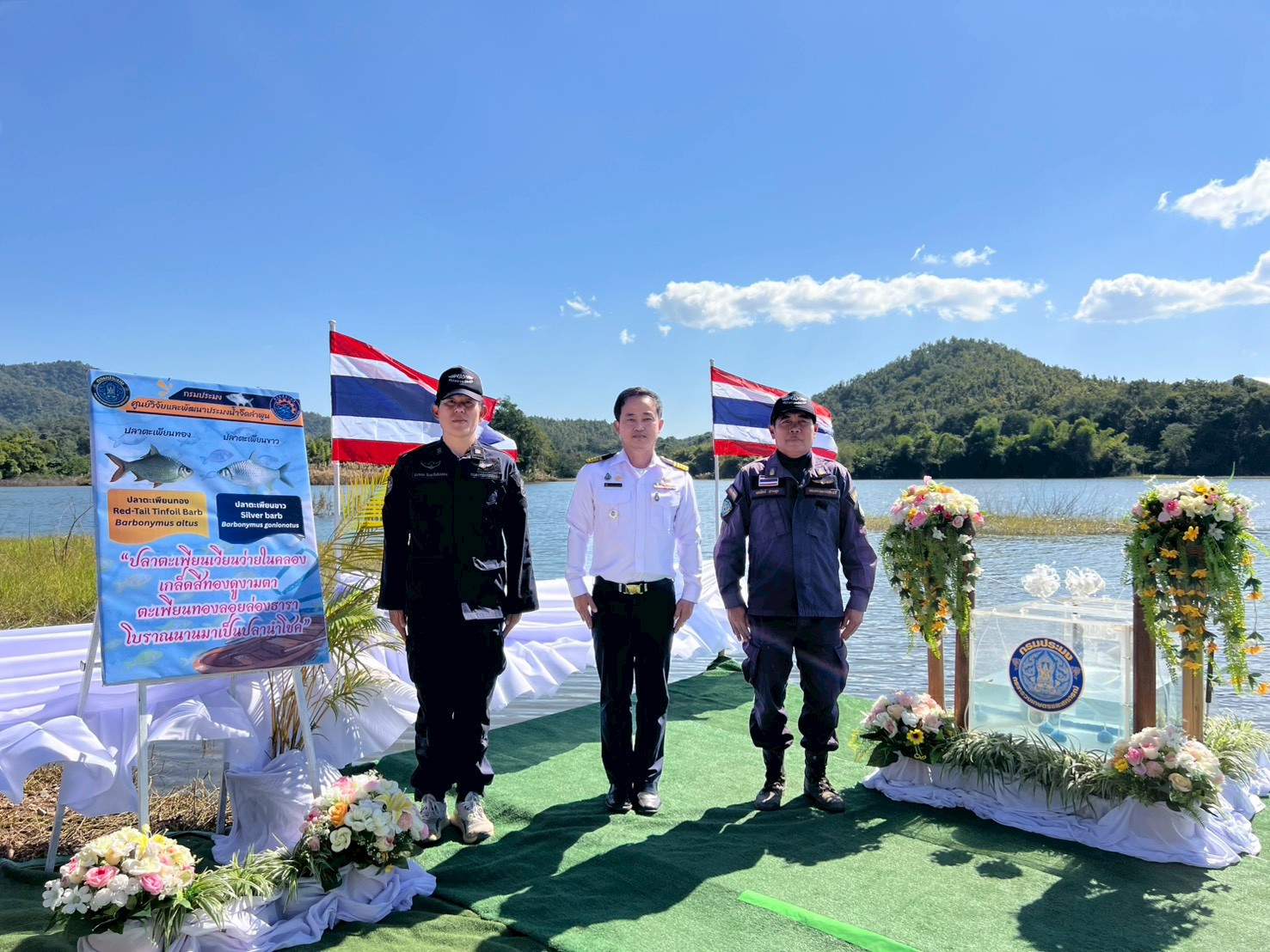 ร่วมให้การต้อนรับ นายพลากร สุวรรณรัฐ องคมนตรี และคณะ ในการติดตามและขับเคลื่อนโครงการอันเนื่องมาจากพระราชดำริ พื้นที่จังหวัดลำพูน ณ อ่างเก็บน้ำห้วยโป่ง ตำบลนครเจดีย์ อำเภอป่าซาง จังหวัดลำพูน ในโอกาสนี้ องคมนตรี ได้เป็นประธานในการปล่อยพันธุ์สัตว์น้ำ ได้แก่ ปลาตะเพียนทอง และปลาตะเพียนขาว จำนวน 50,000 ตัว ลงสู่อ่างเก็บน้ำฯ เพื่อเพิ่มผลผลิตสัตว์น้ำในแหล่งน้ำ ซึ่งได้รับการสนับสนุนพันธุ์สัตว์น้ำ จากศูนย์วิจัยและพัฒนาประมงน้ำจืดลำพูน