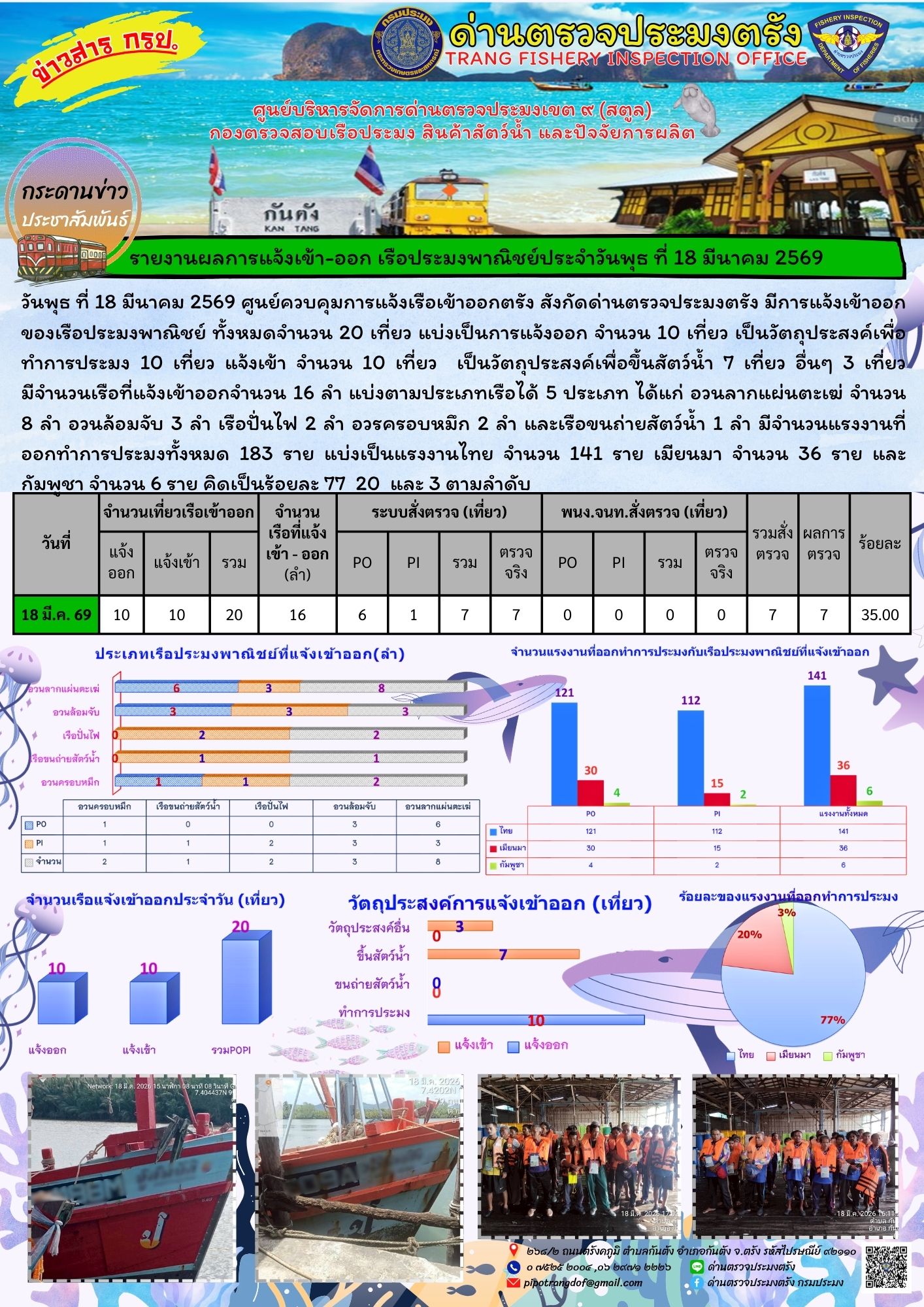วันพุธ ที่ 18 มีนาคม 2569 ศูนย์ควบคุมการแจ้งเรือเข้าออกตรัง สังกัดด่านตรวจประมงตรัง มีการแจ้งเข้าออกของเรือประมงพาณิชย์ ทั้งหมดจำนวน 20 เที่ยว แบ่งเป็นการแจ้งออก จำนวน 10 เที่ยว เป็นวัตถุประสงค์เพื่อทำการประมง 10 เที่ยว แจ้งเข้า จำนวน 10 เที่ยว เป็นวัตถุประสงค์เพื่อขึ้นสัตว์น้ำ 7 เที่ยว อื่นๆ 3 เที่ยว มีจำนวนเรือที่แจ้งเข้าออกจำนวน 16 ลำ แบ่งตามประเภทเรือได้ 5 ประเภท ได้แก่ อวนลากแผ่นตะเฆ่ จำนวน 8 ลำ อวนล้อมจับ 3 ลำ เรือปั่นไฟ 2 ลำ อวรครอบหมึก 2 ลำ และเรือขนถ่ายสัตว์น้ำ 1 ลำ มีจำนวนแรงงานที่ออกทำการประมงทั้งหมด 183 ราย แบ่งเป็นแรงงานไทย จำนวน 141 ราย เมียนมา จำนวน 36 ราย และกัมพูชา จำนวน 6 ราย คิดเป็นร้อยละ 77 20 และ 3 ตามลำดับ