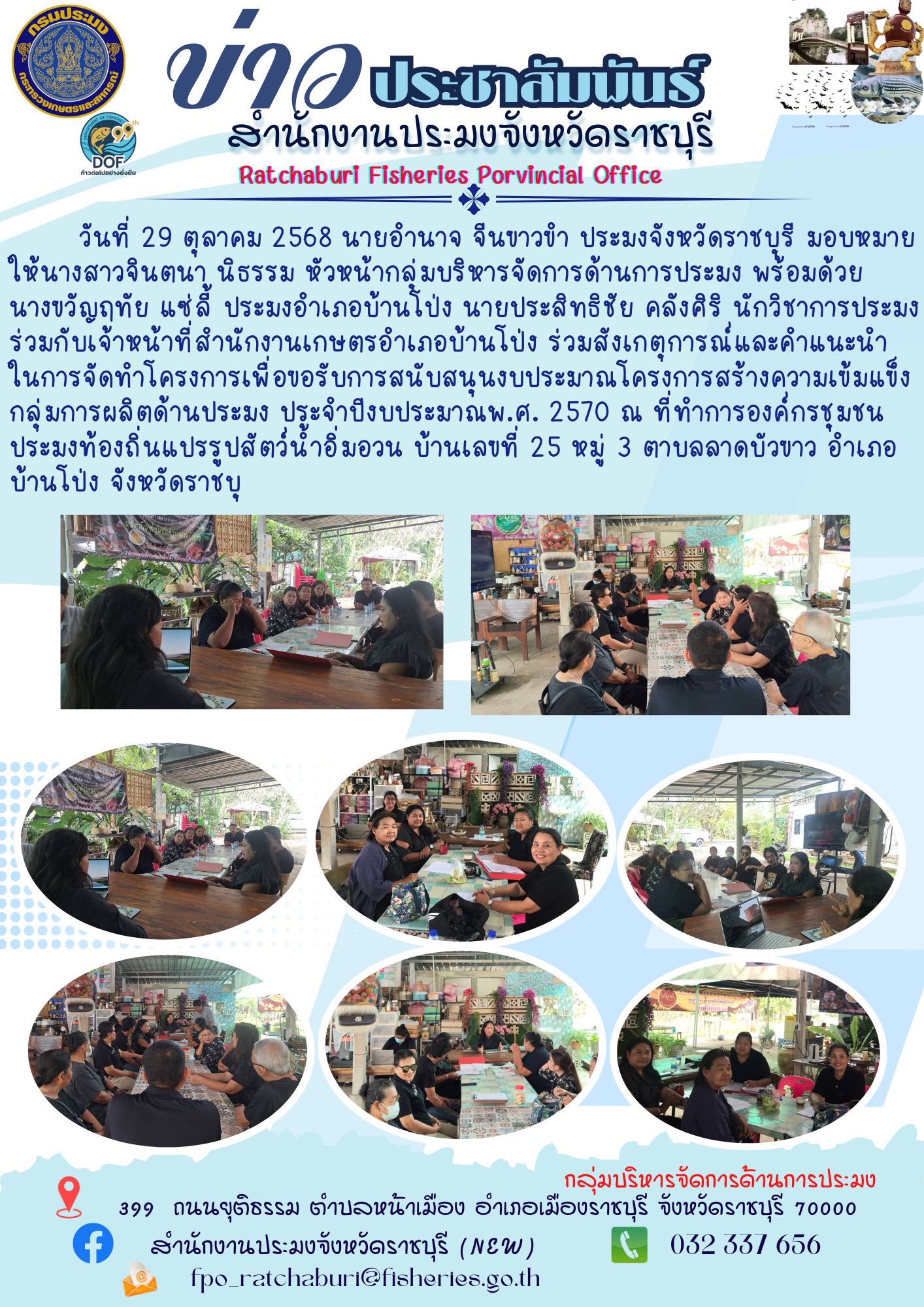 วันที่ 29 ตุลาคม 2568 นายอำนาจ จีนขาวขำ ประมงจังหวัดราชบุรี มอบหมายให้ นางสาวจินตนา นิธรรม หัวหน้ากลุ่มบริหารจัดการด้านการประมง พร้อมด้วยนางขวัญฤทัย แซ่ลี้ ประมงอำเภอบ้านโป่ง นายประสิทธิชัย คลังศิริ นักวิชาการประมง ร่วมกับเจ้าหน้าที่สำนักงานเกษตรอำเภอบ้านโป่ง ร่วมสังเกตุการณ์และคำแนะนำในการจัดทำโครงการเพื่อขอรับการสนับสนุนงบประมาณโครงการสร้างความเข้มแข็งกลุ่มการผลิตด้านประมง ประจำปีงบประมาณพ.ศ. 2570 ณ ที่ทำการองค์กรชุมชนประมงท้องถิ่นแปรรูปสัตว์น้ำอิ่มอวน บ้านเลขที่ 25 หมู่ 3 ตาบลลาดบัวขาว อำเภอบ้านโป่ง จังหวัดราชบุรี