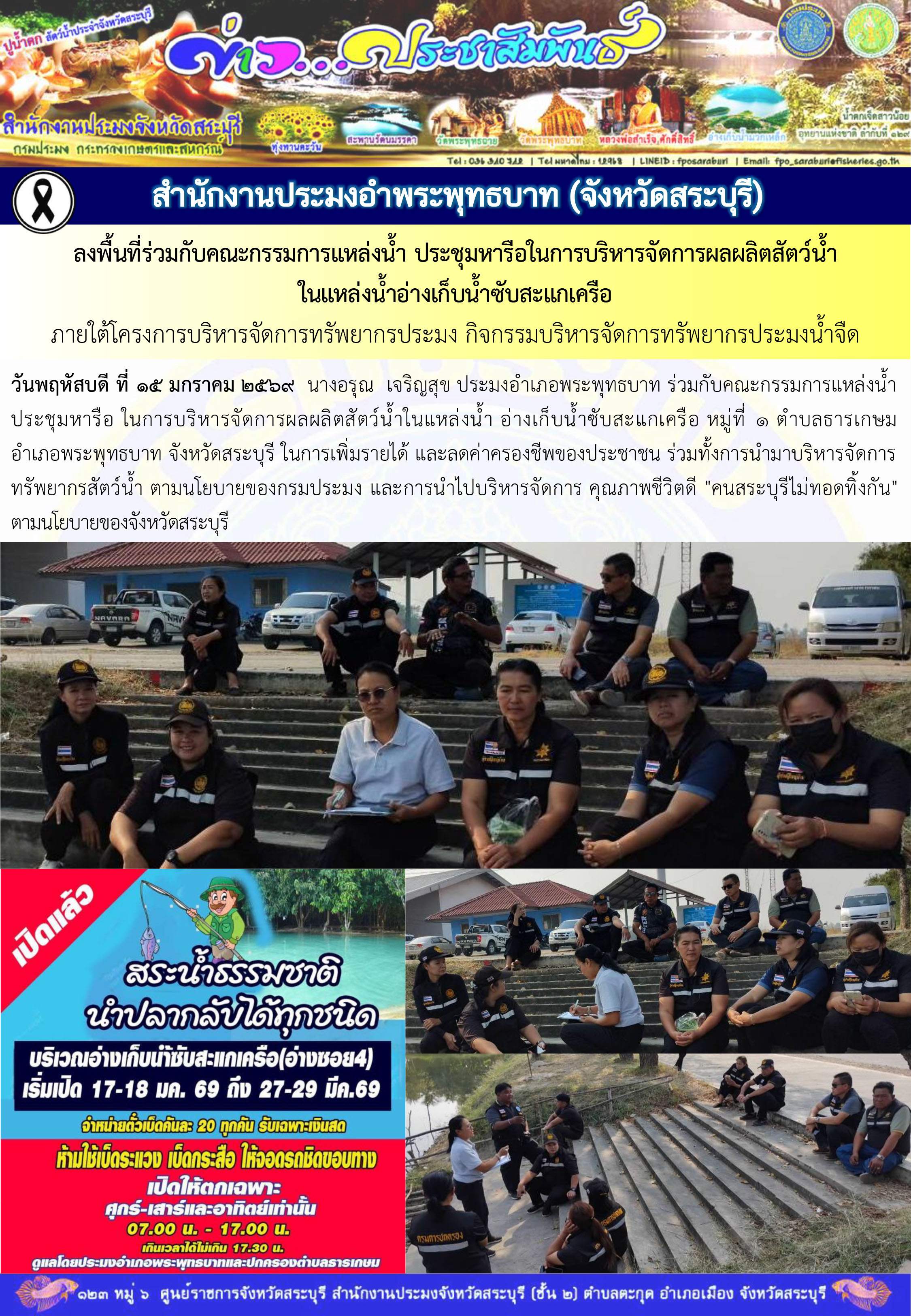 วันพฤหัสบดี ที่ 15 มกราคม 2569 นางอรุณ เจริญสุข ประมงอำเภอพระพุทธบาท ร่วมกับคณะกรรมการแหล่งน้ำ ประชุมหารือ ในการบริหารจัดการผลผลิตสัตว์น้ำในแหล่งน้ำ อ่างเก็บน้ำซับสะแกเครือ หมู่ที่ 1 ตำบลธารเกษม อำเภอพระพุทธบาท จังหวัดสระบุรี ในการเพิ่มรายได้ และลดค่าครองชีพของประชาชน ร่วมทั้งการนำมาบริหารจัดการทรัพยากรสัตว์น้ำ ตามนโยบายของกรมประมง และการนำไปบริหารจัดการ คุณภาพชีวิตดี "คนสระบุรีไม่ทอดทิ้งกัน" ตามนโยบายของจังหวัดสระบุรี