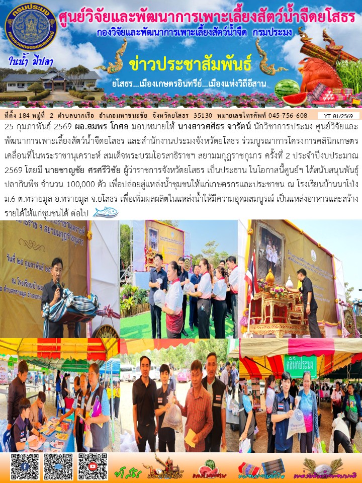(2.3) ศูนย์วิจัยและพัฒนาการเพาะเลี้ยงสัตว์น้ำจืดยโสธรจะดำเนินการตามข้อ (2.1) – (2.2) เมื่อได้รับความยินยอม