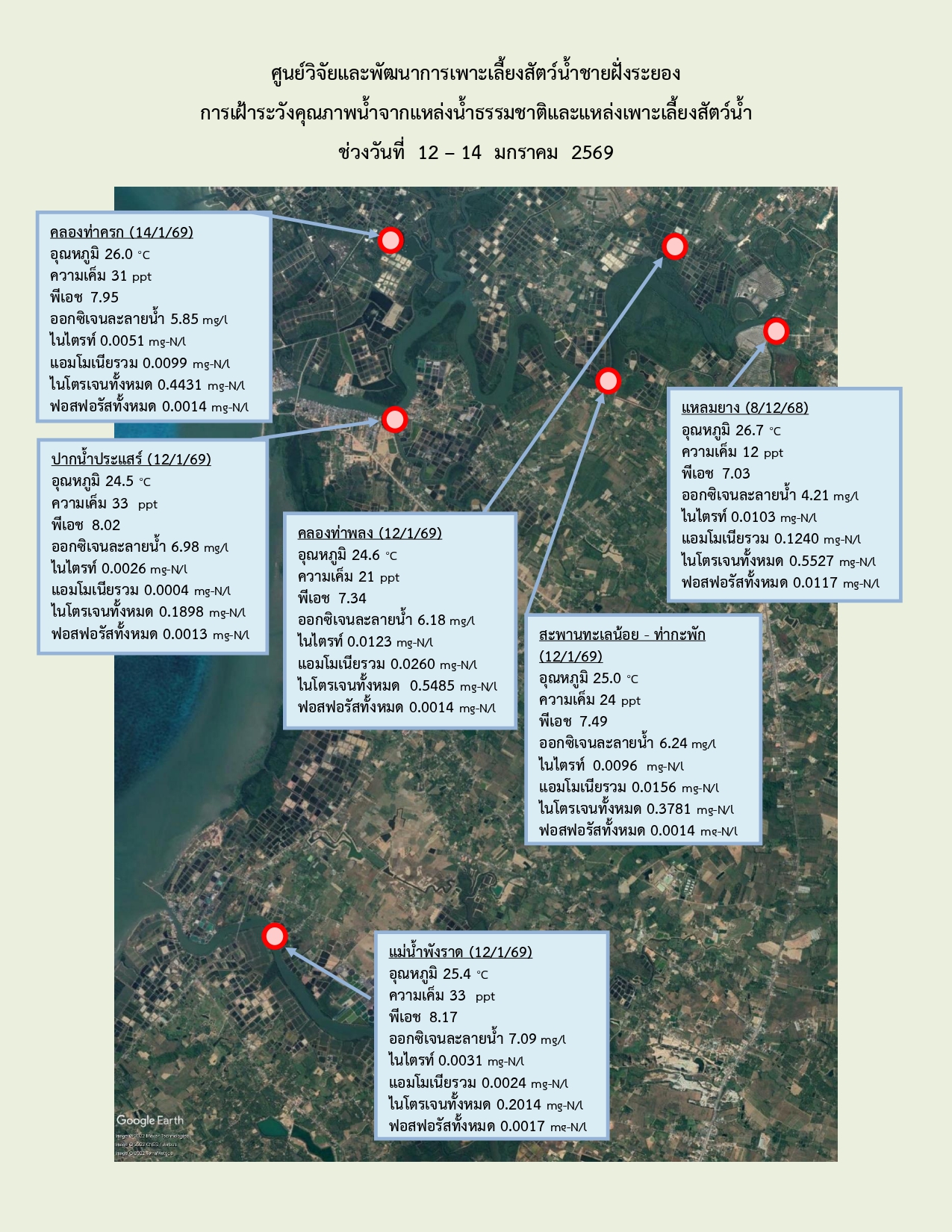 NEW คุณภาพน้ำชายฝั่งและแหล่งเลี้ยงกุ้งทะเลจังหวัดระยอง ประจำเดือนมกราคม  2569..คลิก