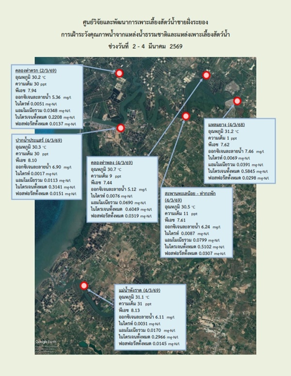คุณภาพน้ำชายฝั่งและแหล่งเลี้ยงกุ้งทะเลจังหวัดระยอง ประจำเดือนมีนาคม 2569..คลิก